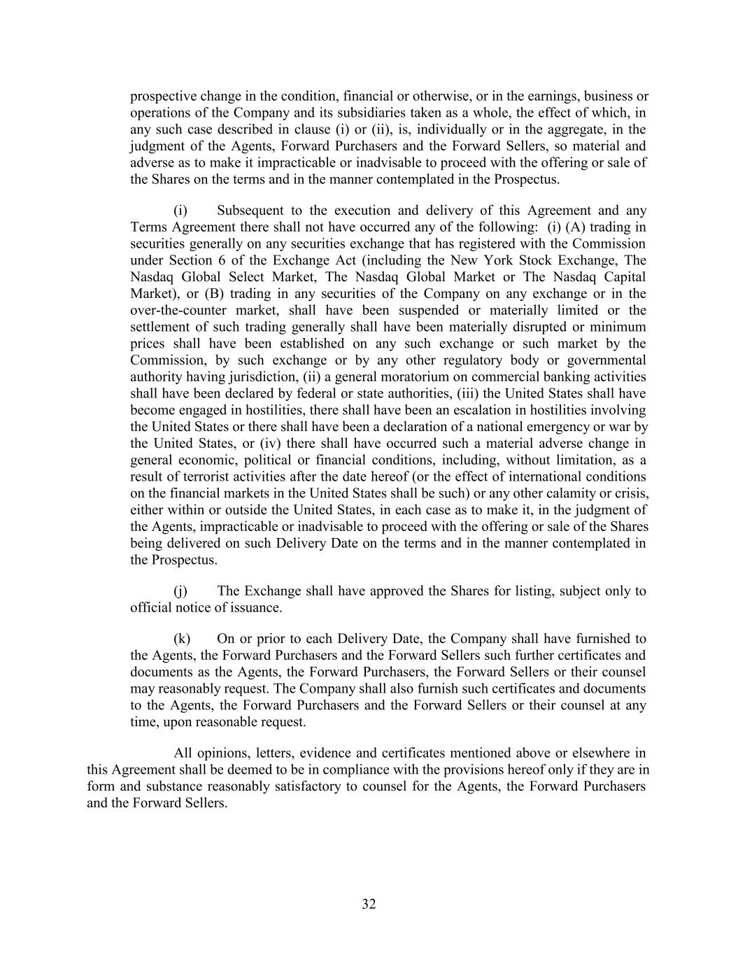 公司及其附属公司整体的状况(财务或其他方面)或收益、业务或营运的预期变动,在第(i)或(ii)条所述的任何该等情况下,其影响在代理、远期买方和远期卖方的判断中单独或合计而言,是重大和不利的,以致按招股章程所设想的条款和方式进行股份发售或出售变得不切实际或不可取。(i)在本协议和任何条款协议的执行和交付之后,不得发生以下任何情况:(i)(a)在根据《交易法》第6条向委员会登记的任何证券交易所(包括纽约证券交易所、纳斯达克全球精选市场、纳斯达克全球市场或纳斯达克资本市场)进行证券交易,或(b)在任何交易所或场外交易市场进行公司的任何证券交易,应已被暂停或受到实质性限制,或此类交易的结算一般应已受到实质性干扰,或最低价格应已由委员会、该交易所或具有管辖权的任何其他监管机构或政府当局在任何此类交易所或此类市场上确定,(ii)联邦或州当局应已宣布全面暂停商业银行活动,(iii)美国应已陷入敌对行动,涉及美国的敌对行动应已升级,或美国已宣布国家紧急状态或战争,或(iv)一般经济、政治或金融条件应已发生此类重大不利变化,包括但不限于由于本协议日期之后的恐怖活动(或国际条件对美国金融市场的影响应如此)或美国境内或境外的任何其他灾难或危机,在每种情况下均导致,根据代理人的判断,按照招股说明书中设想的条款和方式进行在该交割日交付的股份的发售或出售是不切实际或不可取的。(j)联交所应已批准股份上市,惟须发出正式发行通知。(k)在每个交付日期或之前,公司应已向代理、远期买方和远期卖方提供代理、远期买方、远期卖方或其律师可能合理要求的进一步证明和文件。公司还应在合理要求下,随时向代理、远期买方和远期卖方或其律师提供此类证明和文件。上述或本协议其他部分中提及的所有意见、信函、证据和证明,只有在形式和实质上令代理、远期买方和远期卖方的律师合理满意时,才应被视为符合本协议的规定。32