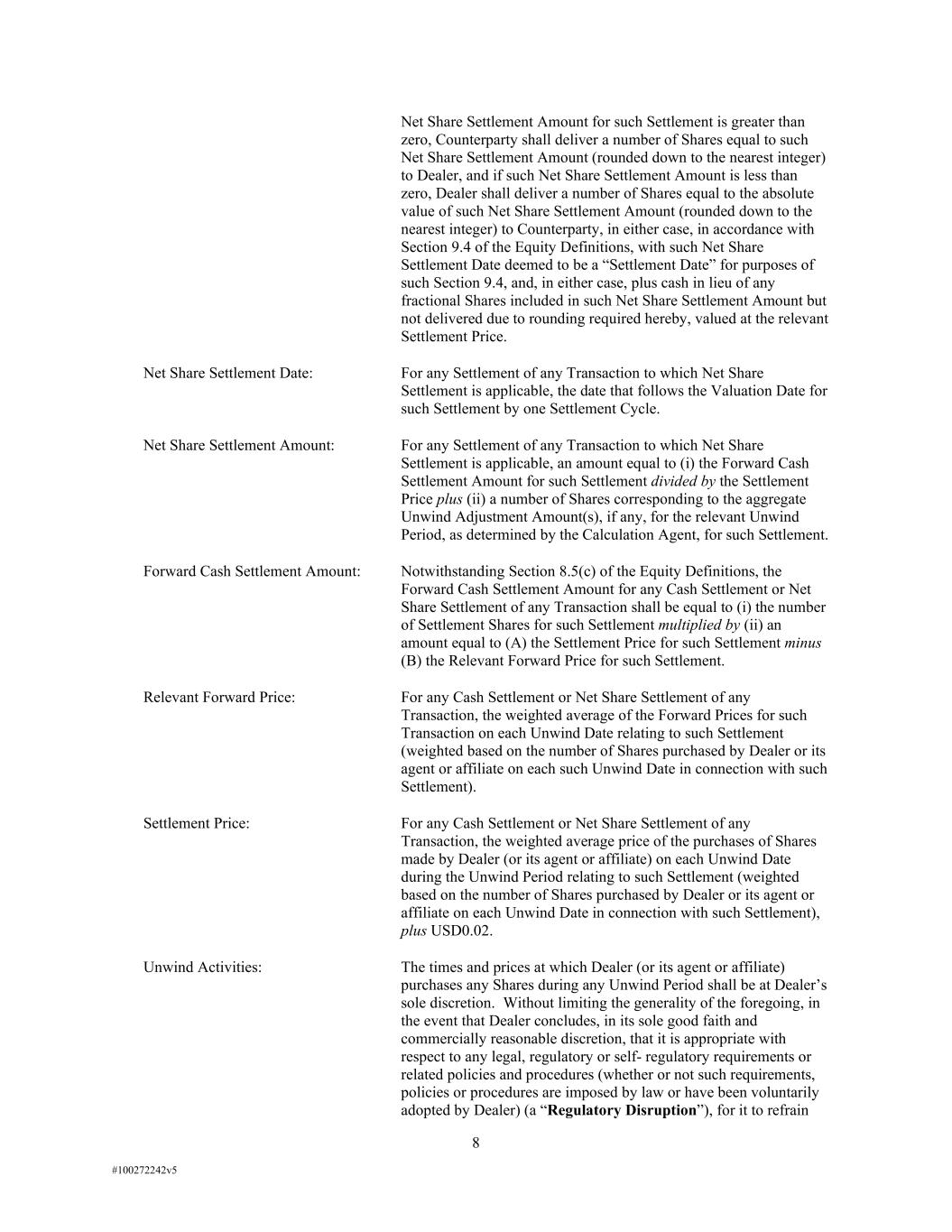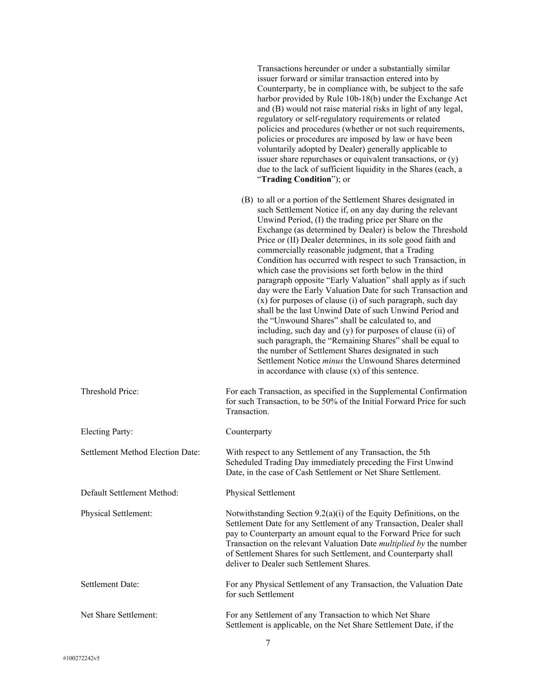 7 # 100272242v5根据本协议或根据由交易对手订立的实质上相似的发行人远期或类似交易进行的交易,符合、受《交易法》第10b-18(b)条规定的安全港约束,且(b)不会因任何法律、监管或自律要求或相关政策和程序(无论此类要求、政策或程序是否由法律规定或已被交易商自愿采用)而引发重大风险,或(y)由于股份缺乏足够的流动性(每一项,a“交易条件”);或(b)如果在相关解盘期内的任何一天,(i)交易所的每股交易价格(由交易商确定)低于门槛价,或(II)交易商根据其完全善意和商业上合理的判断,确定就该交易已发生交易条件,则向该结算通知中指定的全部或部分结算股份,在此情况下,下文第三款与“提前估值”相对的条文适用,犹如该日为该交易的提前估值日期及(x)就该款第(i)款而言,该日为该解盘期的最后解盘日,而“未平仓股份”须计算至,并包括该日及(y)就该款第(ii)款而言,“剩余股份”应等于该结算通知中指定的结算股份数量减去根据本句第(x)条确定的未平仓股份。门槛价:对于每笔交易,如该交易的补充确认书中规定,为该交易的初始远期价格的50%。选择方:交易对手结算方式选择日:就任何交易的任何结算而言,紧接第一个解盘日之前的第5个预定交易日,在现金结算或净份额结算的情况下。违约结算方式:实物结算实物结算:尽管有权益定义第9.2(a)(i)节的规定,在任何交易的任何结算的结算日,交易商应向交易对手支付相当于相关估值日该交易的远期价格乘以该结算的结算股份数量的金额,交易对手应向交易商交付该结算股份。结算日:对于任何交易的任何实物结算,该结算净股结算的估值日:对于适用净股结算的任何交易的任何结算,在净股结算日,如果
