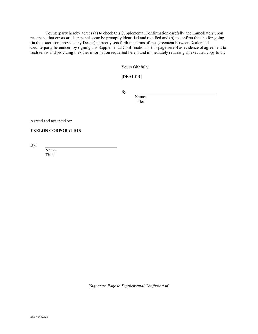 # 100272242v5交易对方特此同意(a)在收到本补充确认书后立即仔细核对,以便能够迅速识别和纠正错误或差异;(b)通过签署本补充确认书或本协议本页作为同意此类条款的证据并提供本协议要求的其他信息并立即将已执行的副本退回给我们,确认前述(以交易商提供的确切格式)正确地阐述了交易商和交易对方在本协议项下的协议条款。您忠实,[经销商]由:姓名:标题:同意并接受:ExXELON CORPORATION由:______________________________________姓名:标题:[签名页以补充确认]