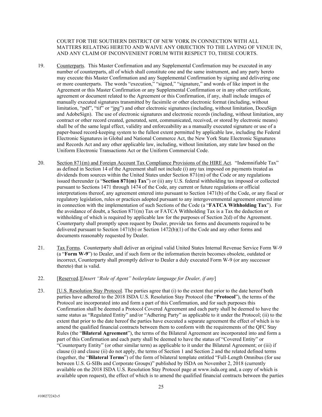 25 # 100272242v5纽约南区法院涉及与此有关的所有事项,并放弃对在这些法院设置场地的任何异议,以及与此有关的任何不方便的论坛索赔。19.同行。本主确认书和任何补充确认书可以在任意数量的对应方中执行,所有这些都应构成同一文书,本合同任何一方可以通过签署并交付一个或多个对应方来执行本主确认书和任何补充确认书。协议或本主确认书或任何补充确认书或与协议或本确认书有关的任何其他证书、协议或文件(如有)中的“执行”、“已签署”、“签名”和类似的字样,应包括以传真或其他电子格式(包括但不限于“pdf”、“tif”或“jpg”)传输的手工执行的签名和其他电子签名(包括但不限于DocuSign和AdobeSign)的图像。电子签名和电子记录(包括但不限于通过电子方式创建、生成、发送、传达、接收或存储的任何合同或其他记录)的使用,应在适用法律,包括《全球和国家商务联邦电子签名法》、《纽约州电子签名和记录法》以及任何其他适用法律,包括但不限于基于《统一电子交易法》或《统一商法典》的任何州法律允许的最大范围内,与人工执行的签名或使用纸质记录系统具有相同的法律效力、有效性和可执行性。20.第871(m)节和《HIRE法案》的外国账户税收合规条款。该协议第14节中定义的“应赔税款”不应包括(i)根据《守则》第871(m)条或根据其发布的任何法规(“第871(m)条税款”)对美国境内被视为股息来源的付款征收的任何税款,或(ii)根据《守则》第1471至1474条、任何现行或未来的法规或其官方解释、根据《守则》第1471(b)条订立的任何协议或任何财政或监管法规征收或征收的任何美国联邦预扣税,根据为实施《守则》这些章节而订立的任何政府间协议采用的规则或做法(“FATCA预扣税”)。为免生疑问,第871(m)节税款或FATCA预扣税是适用法律为本协议第2(d)节的目的要求扣除或预扣的税款。交易对手应在交易商要求下迅速提供根据《守则》第1471(b)条或第1472(b)(1)条要求交付的税单和文件以及交易商合理要求的任何其他表格和文件。21.税表。交易对手应向交易商交付一份有效的美国国税局W-9表格原件(一种“W-9表格”),如果该表格或其中的信息过时、过时或不正确,交易对手应立即向交易商交付一份正式签署的有效的W-9表格(或其任何后继表格)。22.[保留。] [插入“代理角色”样板语言经销商,如果有的话] 23。【美国决议中止议定书。双方同意(i)在本协议日期之前双方已遵守2018年ISDA美国决议中止议定书(“议定书”)的范围内,该议定书的条款被纳入并构成本确认书的一部分,为此目的,本确认书应被视为议定书涵盖的协议,每一方应被视为在议定书下具有适用于其的“受监管实体”和/或“加入方”的同等地位;(ii)在本协议日期之前,各方已签署单独的协议,其效力是修订他们之间的合格金融合同,以符合QFC中止规则(“双边协议”)的要求,双边协议的条款纳入并构成本确认书的一部分,各方应被视为具有双边协议项下适用于其的“涵盖实体”或“对手方实体”(或其他类似术语)的地位;或(iii)如果第(i)款和第(ii)款不适用,则第1节和第2节的条款以及ISDA于11月2日发布的题为“Full-Length Omnibus(供美国G-SIBs和企业集团之间使用)”的双边模板形式的相关定义条款(统称“双边条款”),2018年(目前可在www.isda.org的2018年ISDA美国决议中止协议页面上查阅,可索取副本),其效力是修订双方之间的合格金融合同