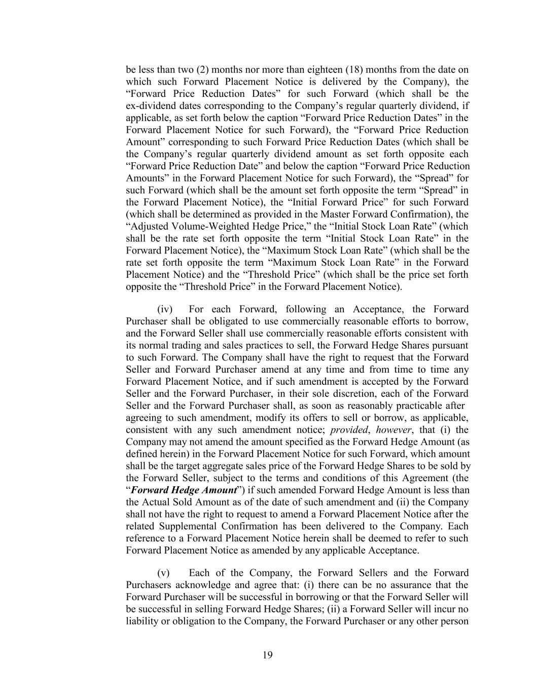 自公司送达该等远期配售通知之日起不到两(2)个月但不超过十八(18)个月),该等远期的“远期降价日期”(如适用,该日期为该等远期的远期配售通知中“远期降价日期”标题下方所述的公司定期季度股息对应的除息日),该等远期降价日期所对应的“远期降价金额”(应为该等远期的各“远期降价日期”对面及远期配售通知中“远期降价金额”标题下方所载公司的常规季度分红金额)、该等远期的“价差”(应为远期配售通知中“价差”一词对面所载金额)、该等远期的“初始远期价格”(应按远期确认总书的规定确定)、“调整后的成交量加权对冲价”,“首次股票贷款利率”(为远期配售通知中“首次股票贷款利率”一词对面规定的利率)、“最高股票贷款利率”(为远期配售通知中“最高股票贷款利率”一词对面规定的利率)和“门槛价格”(为远期配售通知中“门槛价格”对面规定的价格)。(iv)就每笔远期而言,在接受后,远期买方有义务使用商业上合理的努力借款,而远期卖方应使用符合其正常交易和销售惯例的商业上合理的努力根据该远期出售远期对冲股份。公司有权要求远期卖方和远期买方随时不时修订任何远期配售通知,而如该等修订获远期卖方和远期买方接受,则各远期卖方和远期买方应在同意该等修订后在合理可行范围内尽快根据任何该等修订通知修改其出售或借款的要约(如适用);但前提是,(i)公司不得就该等远期修订远期配售通知中指明为远期对冲金额(定义见本协议)的金额,该金额应为远期卖方将出售的远期对冲股份的目标总销售价格,根据本协议的条款和条件(“远期对冲金额”),如果该等经修订的远期对冲金额低于截至该修订日期的实际出售金额,以及(ii)在相关补充确认送达公司后,公司无权要求修订远期配售通知。此处对远期配售通知的每一处提及均应被视为是指经任何适用的接受修订的该远期配售通知。(v)公司、远期卖方和远期买方各自承认并同意:(i)无法保证远期买方将成功借款或远期卖方将成功出售远期对冲股份;(ii)远期卖方将不会对公司、远期买方或任何其他人承担任何责任或义务19