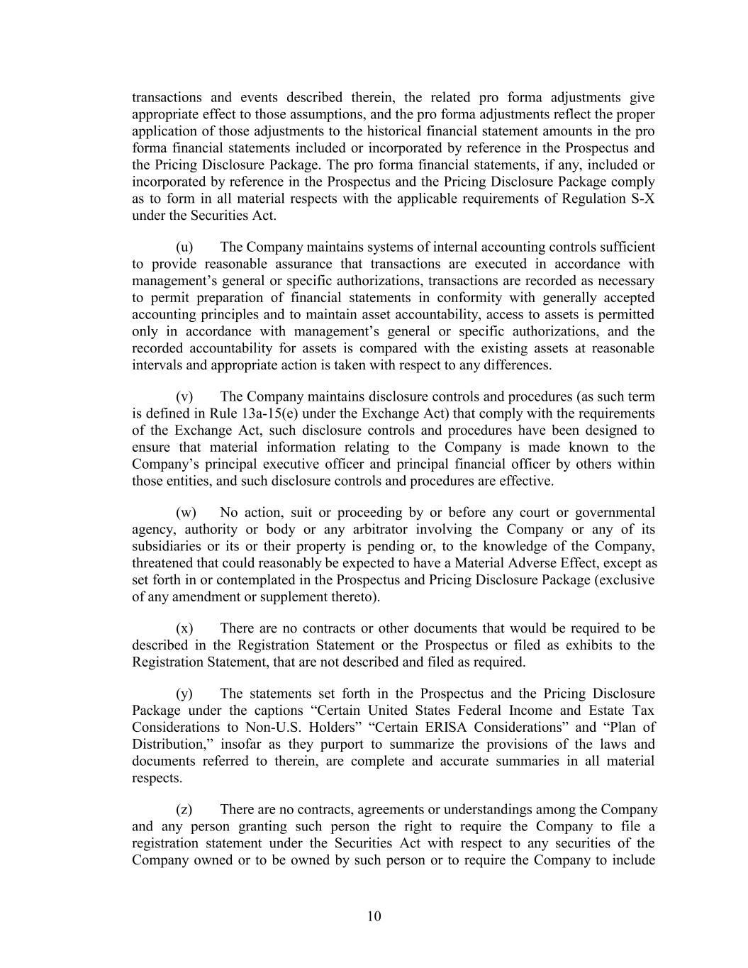 其中描述的交易和事件,相关的备考调整对这些假设产生了适当的影响,而备考调整反映了这些调整对招股说明书和定价披露包中以引用方式包含或纳入的备考财务报表中的历史财务报表金额的适当应用。招股说明书和定价披露包中包含或以引用方式纳入的任何备考财务报表(如有)在所有重大方面的形式均符合《证券法》规定的S-X条例的适用要求。(u)公司维持的内部会计控制系统足以提供合理保证,确保交易是按照管理层的一般或特定授权执行的,交易记录是必要的,以允许按照公认会计原则编制财务报表并保持资产问责制,只有根据管理层的一般或特定授权才允许获取资产,并以合理的时间间隔将记录的资产问责制与现有资产进行比较,并就任何差异采取适当行动。(v)公司维持符合《交易法》要求的披露控制和程序(该术语在《交易法》第13a-15(e)条中定义),此类披露控制和程序旨在确保与公司有关的重要信息由这些实体内的其他人告知公司的首席执行官和首席财务官,并且此类披露控制和程序是有效的。(w)任何法院或政府机构、权威机构或团体或任何仲裁员涉及公司或其任何附属公司或其财产的任何诉讼、诉讼或程序均无待决,或据公司所知,有可能合理地预期会产生重大不利影响的威胁,但《招股说明书》和定价披露包(不包括其任何修订或补充)中所述或预期的除外。(x)没有任何合同或其他文件将被要求在注册声明或招股说明书中描述或作为注册声明的证据提交,这些合同或文件未按要求描述和提交。(y)招股说明书和定价披露包中“对非美国持有人的某些美国联邦所得税和遗产税考虑因素”“某些ERISA考虑因素”和“分配计划”标题下的陈述,只要它们旨在概括其中提及的法律和文件的规定,就是所有重大方面的完整和准确的摘要。(z)公司与任何人之间没有任何合同、协议或谅解,授予该人根据《证券法》要求公司就该人拥有或将拥有的任何公司证券提交登记声明的权利,或要求公司包括10