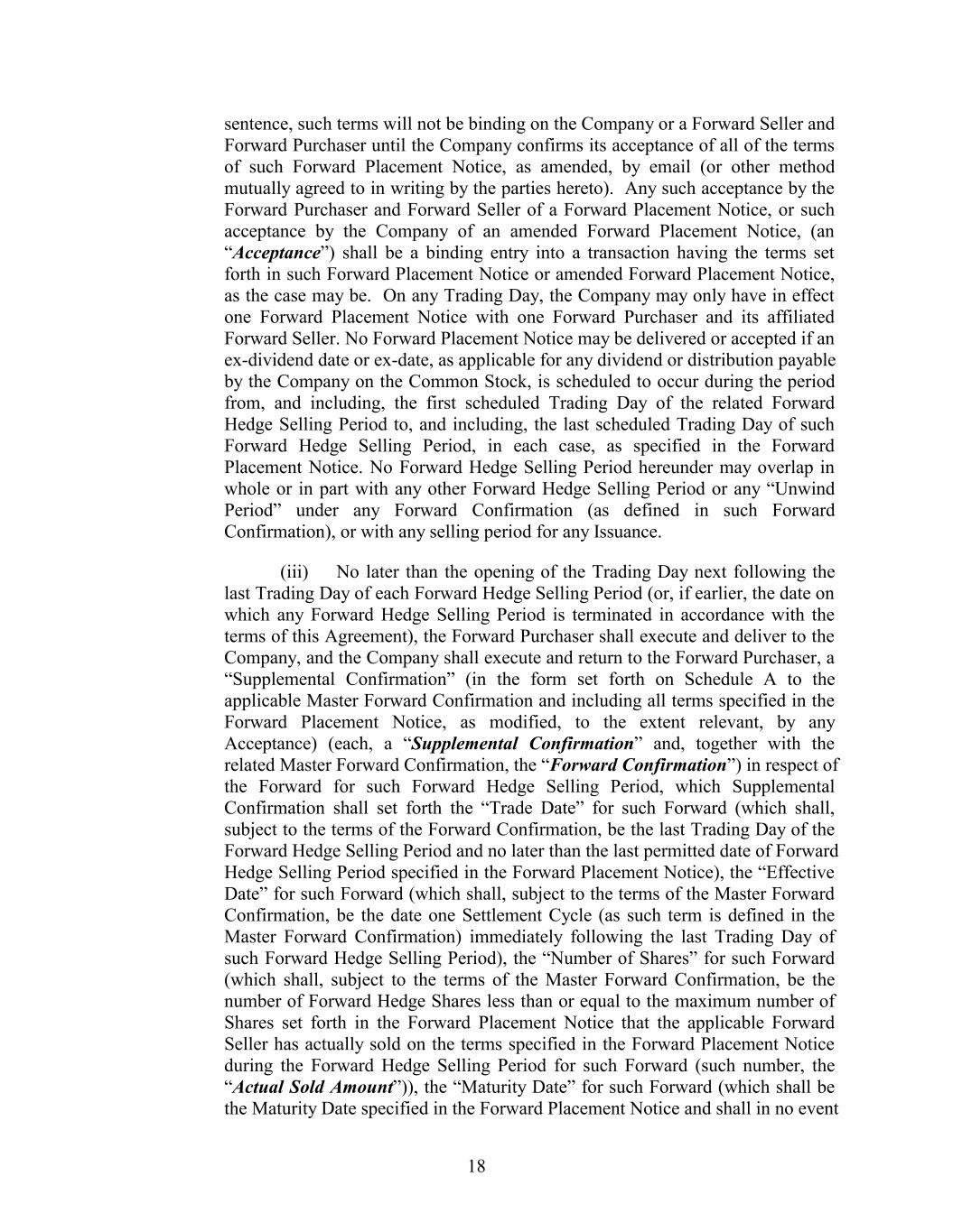 句,在公司通过电子邮件(或双方共同书面同意的其他方式)确认接受经修订的该等远期配售通知的所有条款之前,该等条款将不对公司或远期卖方和远期买方具有约束力。远期买方和远期卖方对远期配售通知的任何此类接受,或公司对经修订的远期配售通知的此类接受(“接受”)应为具有该等远期配售通知或经修订的远期配售通知(视情况而定)中规定的条款的交易的具有约束力的进入。在任何交易日,公司可能仅与一名远期买方及其关联远期卖方有一份有效的远期配售通知。如预期除息日或除息日(适用于公司就普通股应付的任何股息或分派)发生在相关远期对冲卖出期的第一个预定交易日至(包括)该远期对冲卖出期的最后一个预定交易日期间,在每种情况下,如远期配售通知中指明,则不得送达或接受远期配售通知。本协议项下的任何远期对冲卖出期不得与任何其他远期对冲卖出期或任何远期确认书(定义见该远期确认书)项下的任何“解禁期”全部或部分重叠,或与任何发行的任何卖出期重叠。(iii)不迟于每个远期对冲卖出期的最后一个交易日(或如较早,则为任何远期对冲卖出期根据本协议条款终止的日期)的下一个交易日开市,远期买方须签立并向公司交付,而公司须签立并向远期买方退回一份“补充确认书”(以适用的总远期确认书附表A所载的格式,并包括经修订的远期配售通知中指明的所有条款,在相关范围内,以任何接纳方式)(各为一份“补充确认书”,连同相关的总远期确认书、“远期确认书”)就该远期对冲卖出期的远期而言,该补充确认书应载明该远期的“交易日期”(根据远期确认书的条款,该日期应为远期对冲卖出期的最后一个交易日,且不迟于远期配售通知中规定的远期对冲卖出期的最后一个允许日期),该远期的“生效日期”(根据总远期确认书的条款,为紧接该远期对冲卖出期最后一个交易日之后的第一个结算周期(如主远期确认书中所定义的术语)的日期),该远期的“股份数量”(根据主远期确认书的条款,该数量应为低于或等于远期配售通知中规定的、适用的远期卖方在该远期对冲卖出期内已按远期配售通知中规定的条款实际出售的远期对冲股份的最大数量(该数量,“实际卖出金额”)),该等远期的“到期日”(应为远期配售通知中规定的到期日,且在任何情况下均不得为18