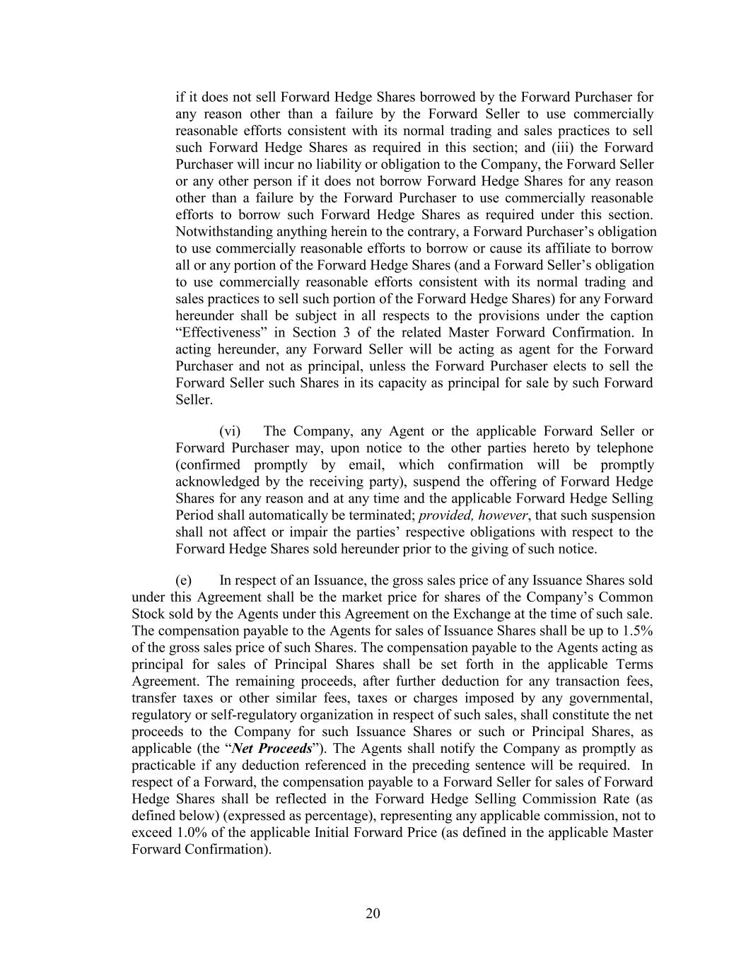 如其不出售远期买方借入的远期对冲股份,而不是由于远期卖方未能按照其正常交易和销售惯例使用商业上合理的努力按本条规定出售该等远期对冲股份;及(iii)远期买方将不会对公司承担任何责任或义务,远期卖方或任何其他人,如果其不因远期买方未能按本条要求使用商业上合理的努力借入此类远期对冲股份以外的任何原因借入远期对冲股份。尽管本协议中有任何相反的规定,远期买方使用商业上合理的努力借入或促使其关联公司借入全部或任何部分远期对冲股份的义务(以及远期卖方使用符合其正常交易和销售惯例的商业上合理的努力出售该部分远期对冲股份的义务)根据本协议进行的任何远期交易,应在所有方面遵守相关总远期确认书第3节中“有效性”标题下的规定。在根据本协议行事时,任何远期卖方将作为远期买方的代理人而不是作为委托人行事,除非远期买方选择以其作为委托人的身份向远期卖方出售该等股份,以供该远期卖方出售。(vi)公司、任何代理人或适用的远期卖方或远期买方可在通过电话向本协议其他各方发出通知(通过电子邮件迅速确认,接收方将迅速确认该确认)后,以任何理由并在任何时间暂停远期对冲股份的发售,适用的远期对冲销售期应自动终止;但该暂停不影响或损害各方在发出该通知之前就根据本协议出售的远期对冲股份各自承担的义务。(e)就发行而言,根据本协议出售的任何发行股份的销售毛价应为该等出售时代理商根据本协议在交易所出售的公司普通股股份的市场价格。就销售发行股份应付各代理的补偿,最高为该等股份销售毛价的1.5%。就销售本金份额应付给代理作为委托人的补偿应在适用的条款协议中规定。余下所得款项,经进一步扣除任何政府、监管或自律组织就该等销售征收的任何交易费用、转让税或其他类似费用、税项或收费后,将构成就该等发行股份或该等或主要股份(如适用)向公司收取的所得款项净额(“所得款项净额”)。如有前句所指的任何扣款需要,代理人应在切实可行的范围内尽快通知公司。就远期而言,就远期对冲股份的销售应付给远期卖方的补偿应反映在远期对冲销售佣金率(定义见下文)(以百分比表示)中,代表任何适用的佣金,不得超过适用的初始远期价格(定义见适用的总远期确认书)的1.0%。20