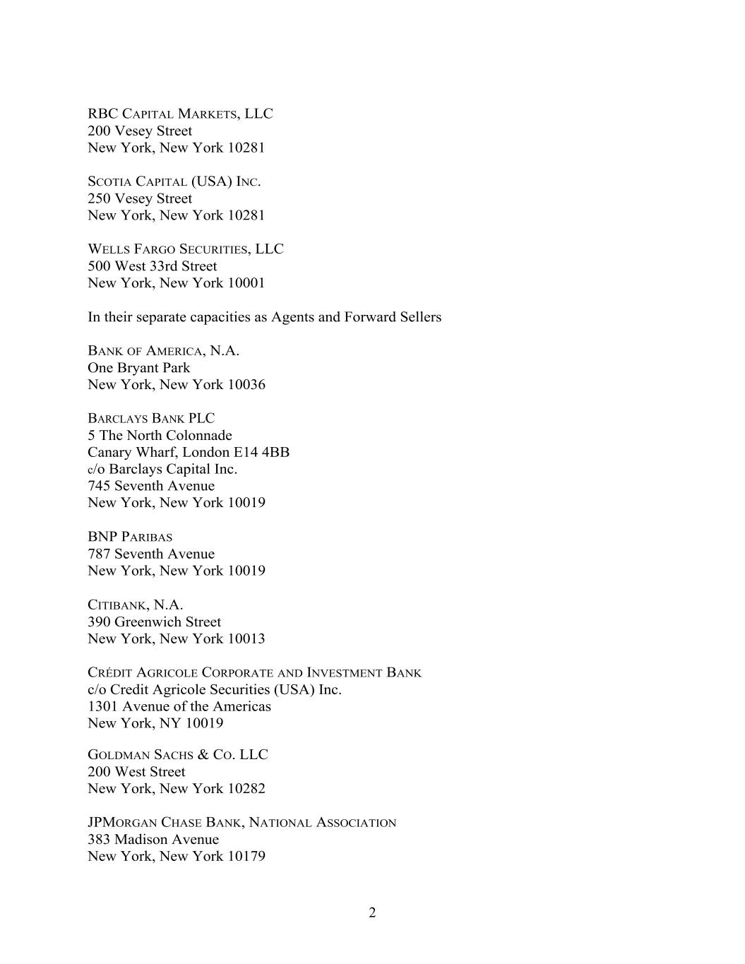 RBC CAPITAL Markets,LLC 200 Vesey Street New York,New York 10281 SCOTIA CAPITAL(USA)INC. 250 Vesey Street New York,New York 10281 WELLS FARGO SECURITIES,LLC 500 West 33rd Street New York,New York 10001分别以代理和远期卖方BANK of AMERICA,N.A.身份One Bryant Park New York,New York 10036 BARCLAYS BANK PLC 5 The North Colonnade Canary Wharf,London E14 4BB c/o BARCLAYS CAPITAL INC. 745 Seventh Avenue New York,New York 10019 BNP Paribas 787 Seventh Avenue New York,New York 10019 CITIBANK,N.A. 390Greenwich Street New York,New York 10013 CR é dIT AGRICOLE CORPORATE AND Investment BANK c/o Credit Agricole Securities(USA)Inc. 1301 Avenue of the Americas New York,NY 10019 GOLDMAN SACHS & CO. LLC 200 West Street New York,New York 10282 JPMorgan CHASE BAN纽约101792