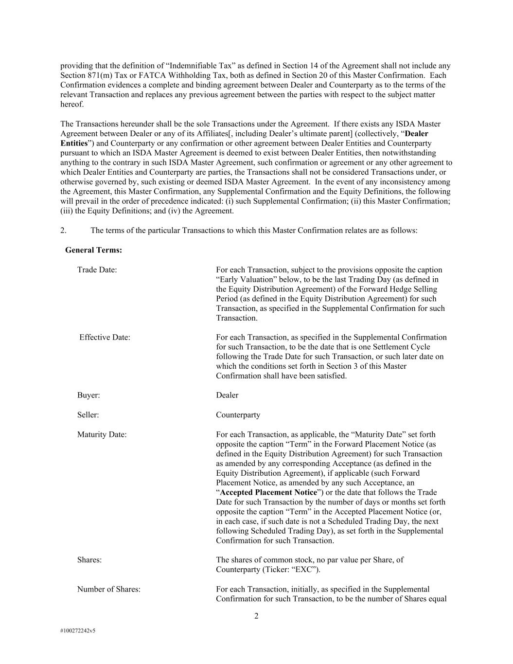 2 # 100272242v5规定,协议第14节中定义的“应赔税款”的定义不应包括任何第871(m)节税款或FATCA预扣税,这两者均在本主确认书第20节中定义。每份确认书均证明交易商和交易对手就相关交易的条款达成了完整且具有约束力的协议,并取代了双方之前就本协议标的达成的任何协议。本协议项下的交易为本协议项下的唯一交易。如果交易商或其任何关联[,包括交易商的最终母公司](统称为“交易商实体”)与交易对手之间存在任何ISDA主协议,或交易商实体与交易对手之间的任何确认或其他协议,据此,交易商实体之间被视为交易商实体之间存在ISDA主协议,则尽管该ISDA主协议、该确认或协议或交易商实体和交易对手作为当事方的任何其他协议中有任何相反的规定,该交易不应被视为根据该现有或被视为ISDA主协议进行的交易,或受该现有或被视为ISDA主协议的其他管辖。如协议、本主确认、任何补充确认及权益定义有任何不一致之处,将按所示优先顺序以以下为准:(i)该等补充确认;(ii)本主确认;(iii)权益定义;及(iv)该协议。2.本主确认书所涉及的特定交易的条款如下:一般条款:交易日期:就每笔交易而言,在符合下文“提前估值”标题对面的规定的情况下,为该交易的补充确认书中规定的该交易的远期对冲售期(定义见Equity Distribution协议)的最后一个交易日(定义见该交易的补充确认书)。生效日期:就每宗交易而言,如有关该交易的补充确认书所指明,须为该交易的交易日期后一个结算周期的日期,或本总确认书第3节所载条件应已获满足的较后日期。买方:交易商卖方:交易对手到期日:就每笔交易(如适用)而言,经任何相应接受(定义见Equity Distribution协议)修订的该交易的远期配售通知(定义见Equity Distribution协议)中“期限”标题对面所载的“到期日”(如适用)(该远期配售通知,经任何该等接受修订,“已接受的配售通知”)或该交易日期之后的日期,按已接受的配售通知中“期限”标题对面所载的天数或月份(或,在每种情况下,如该日期不是预定交易日,则为下一个预定交易日),如该交易的补充确认书所述。股份:交易对方的普通股股份,每股无面值(股票代码:“EXC”)。股份数目:就每宗交易而言,初步按有关该交易的补充确认书所指明,为股份数目相等