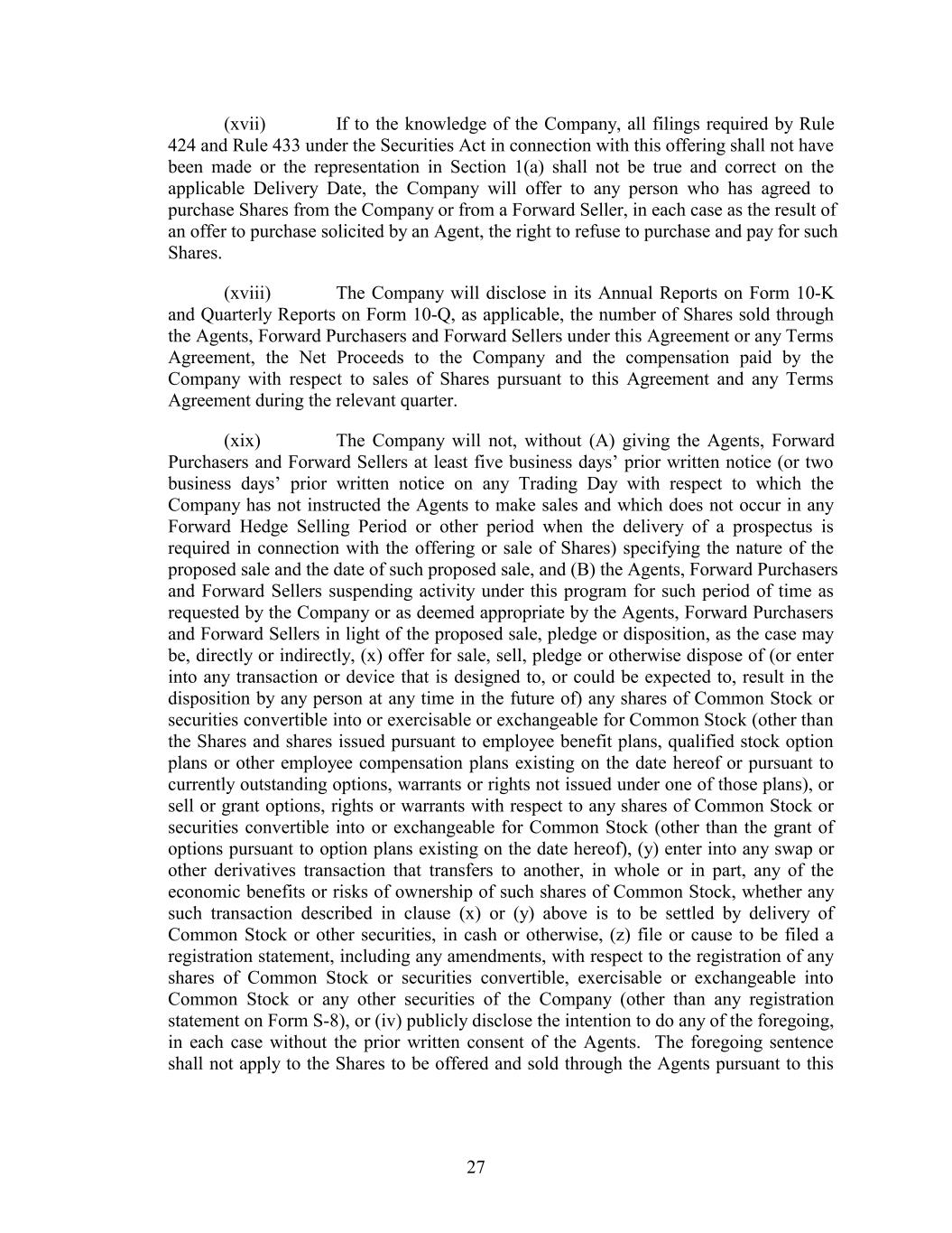 (xvii)如据公司所知,《证券法》第424条和第433条规定的与本次发行有关的所有备案均未作出,或第1(a)节中的陈述在适用的交割日不应真实和正确,则公司将向任何已同意从公司或远期卖方购买股份的人(在每种情况下,由于代理人征集的购买要约的结果)提供拒绝购买和支付该等股份的权利。(xviii)公司将于表格10-K的年度报告及表格10-Q的季度报告(如适用)中披露根据本协议或任何条款协议透过代理、远期买方及远期卖方出售的股份数目、公司所得款项净额及公司于有关季度根据本协议及任何条款协议出售股份而支付的补偿。(xix)公司将不会在(a)向代理、远期买方及远期卖方发出至少五个营业日的事先书面通知(或公司未指示代理进行销售的任何交易日的两个营业日的事先书面通知,而该通知并不发生在任何远期对冲销售期间或就股份发售或销售需要交付招股章程的其他期间)指明建议销售的性质及该等建议销售的日期,及(b)代理,远期买方和远期卖方根据公司要求或代理、远期买方和远期卖方认为适当的情况,根据提议的出售、质押或处置(视情况而定)直接或间接暂停本计划下的活动,(x)要约出售、出售、质押或以其他方式处置(或进行任何旨在或可能预期,导致任何人在未来任何时间处置)任何可转换为或可行使或可交换为普通股的普通股股份或证券(根据雇员福利计划、合格股票期权计划或在本协议日期存在的其他雇员薪酬计划或根据当前尚未行使的期权、认股权证或权利而发行的股份和股份除外),或出售或授予期权,与任何普通股股份或可转换为或可交换为普通股的证券有关的权利或认股权证(根据本协议日期存在的期权计划授予期权除外),(y)订立任何掉期或其他衍生工具交易,将该等普通股股份所有权的任何经济利益或风险全部或部分转移给另一方,无论上述(x)或(y)条所述的任何此类交易将通过以现金或其他方式交付普通股或其他证券来解决,(z)就任何普通股股份或可转换、可行使或可交换为普通股的证券或公司任何其他证券的登记(表格S-8上的任何登记声明除外)提交或安排提交登记声明,包括任何修订,或(iv)公开披露作出上述任何一项的意图,在每种情况下均无须代理人事先书面同意。前述句子不适用于根据本27将通过代理发售和出售的股份