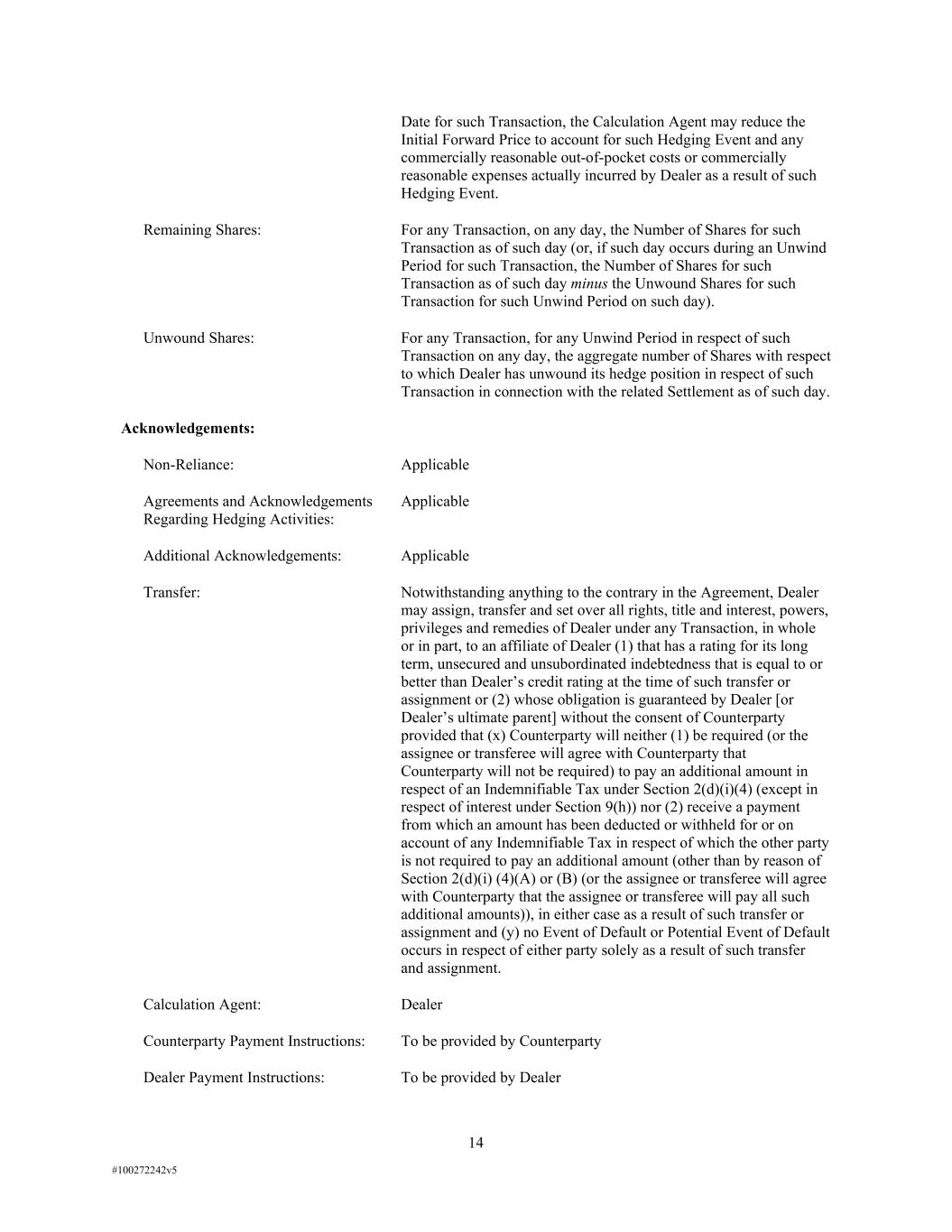 14 # 100272242v5对于此类交易的日期,计算代理可以降低初始远期价格,以计入此类对冲事件以及交易商因此类对冲事件而实际发生的任何商业上合理的自付费用或商业上合理的费用。余下股份:就任何交易而言,在任何一天,截至该日该等交易的股份数目(或,如该日发生在该等交易的解禁期内,则截至该日该等交易的股份数目减去该等解禁期该等交易的解禁股)。平仓股份:就任何交易而言,就任何一天有关该交易的任何平仓期间而言,截至该日交易商就该交易就相关结算解除其对冲头寸的股份总数。鸣谢:不依赖:关于对冲活动的适用协议和鸣谢:适用附加鸣谢:适用转让:尽管协议中有任何相反的规定,交易商可以将交易商在任何交易下的所有权利、所有权和利益、权力、特权和补救措施全部或部分转让、转让和设定给交易商(1)的关联公司,该关联公司对其长期评级,在此类转让或转让时等于或优于交易商信用等级的无担保和非次级债务或(2)其义务由交易商[或交易商的最终母公司]担保而无需交易对手同意的条件下,(x)交易对手既不会被要求(1)(或受让人或受让人将与交易对手约定该交易对手将不会被要求)就第2(d)(i)(4)条下的应弥偿税款支付额外金额(第9(h)条下的利息除外)或(2)收取已从中扣除或预扣的任何应弥偿税款的款项,而另一方无须就该款项支付额外金额(由于第2(d)(i)(4)(a)或(b)条的原因除外(或受让人或受让人将与交易对手约定由受让人或受让人支付所有该等额外金额),在任何一种情况下,由于此类转让或转让,以及(y)任何一方均不会仅因此类转让和转让而发生违约事件或潜在违约事件。计算代理:交易商交易对手付款说明:由交易对手提供交易商付款说明:由交易商提供