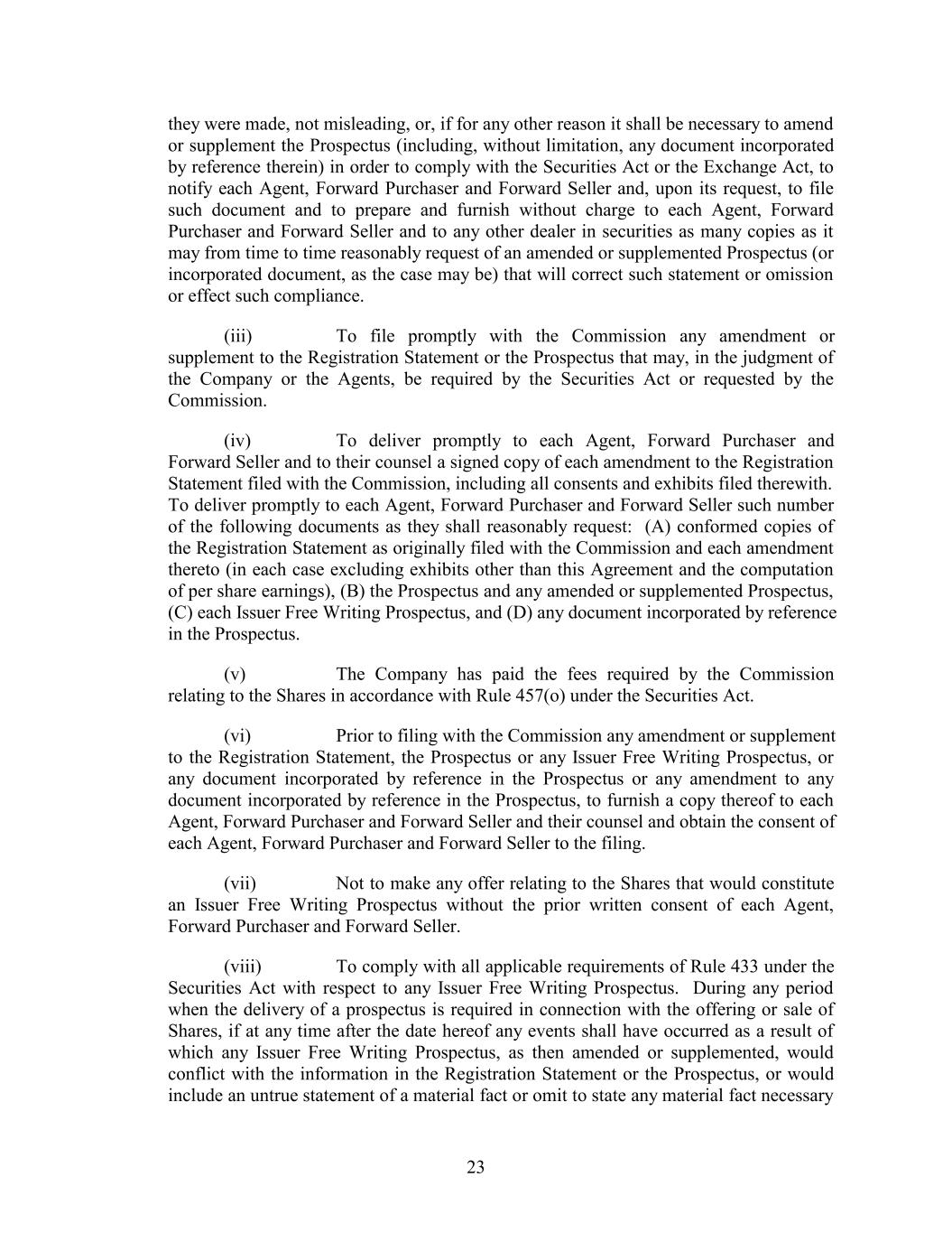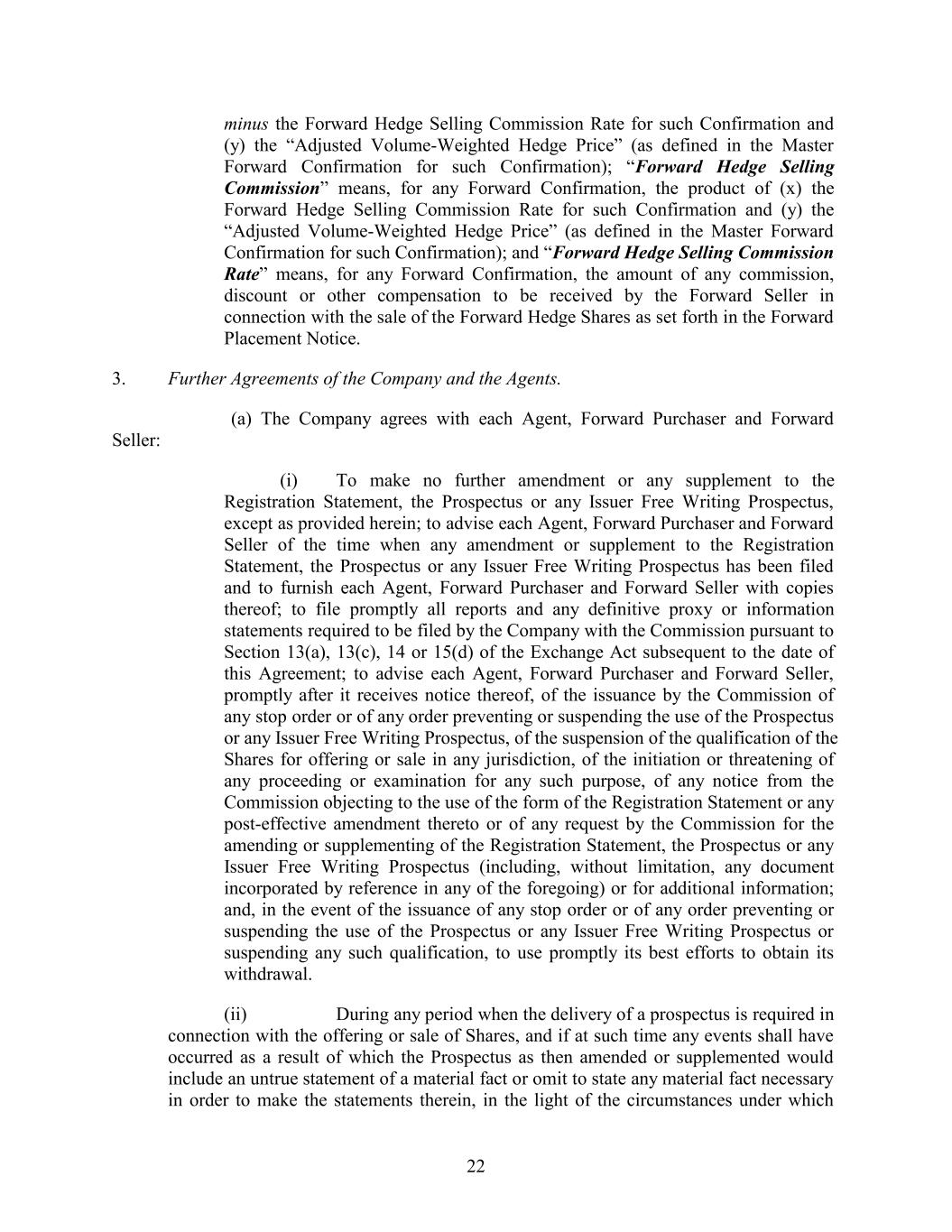 减去此类确认的远期对冲销售佣金率和(y)“调整后的成交量加权对冲价”(定义见此类确认的主远期确认书);“远期对冲销售佣金”是指,就任何远期确认而言,(x)此类确认的远期对冲销售佣金率和(y)“调整后的成交量加权对冲价”(定义见此类确认的主远期确认书)的乘积;“远期对冲销售佣金率”是指,就任何远期确认而言,任何佣金的金额,远期卖方就远期配售通知中所述的远期对冲股份的出售而将收到的折扣或其他补偿。3.公司与代理商的进一步协议。(a)公司与各代理人、远期买方及远期卖方达成一致:(i)除本协议另有规定外,不得对注册说明书、招股说明书或任何发行人自由撰写的招股说明书作出进一步修订或任何补充;向各代理人、远期买方及远期卖方告知注册说明书、招股说明书或任何发行人自由撰写的招股说明书的任何修订或补充已提交的时间,并向各代理人提供,远期买方和远期卖方及其副本;在本协议日期之后迅速提交公司根据《交易法》第13(a)、13(c)、14或15(d)节要求向委员会提交的所有报告和任何最终代理或信息声明;在收到通知后立即通知每个代理、远期买方和远期卖方,委员会发出任何停止令或任何阻止或暂停使用招股说明书或任何发行人自由编写招股说明书的命令,暂停股份在任何司法管辖区发售或出售的资格,为任何该等目的启动或威胁进行任何程序或审查,委员会发出任何通知,反对使用注册声明的形式或对其的任何生效后修订,或委员会提出任何要求修订或补充注册声明、招股章程或任何发行人自由书面招股章程(包括但不限于以引用方式并入上述任何文件)或提供额外信息;以及,在发出任何停止令或任何阻止或暂停使用招股章程或任何发行人自由撰写招股章程或暂停任何该等资格的命令的情况下,及时以最大努力争取其撤回。(ii)在与股份发售或出售有关而须交付招股章程的任何期间内,且如在该期间发生任何事件,导致当时经修订或补充的招股章程将包括对重大事实的不真实陈述或遗漏陈述任何为在其中作出陈述所必需的重大事实,则根据以下情况22