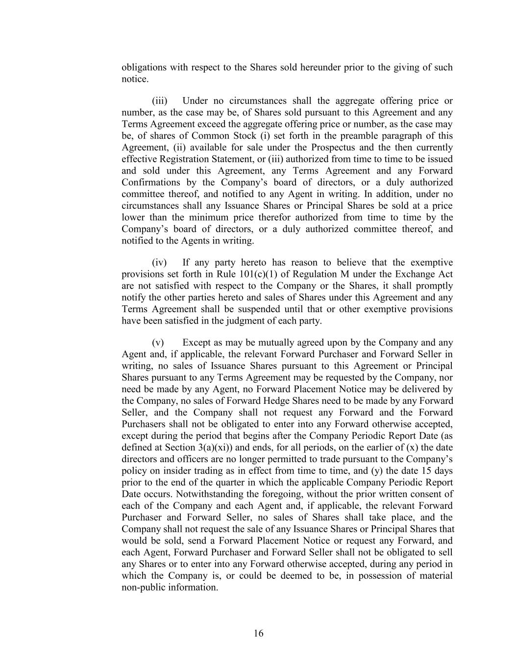 与发出该通知前根据本协议出售的股份有关的义务。(iii)在任何情况下,根据本协议及任何条款协议出售的股份的总发售价或数目(视属何情况而定)均不得超过(i)本协议序言段所载的普通股股份的总发售价或数目(视属何情况而定),(ii)根据招股章程及当时有效的注册声明可供出售,或(iii)不时授权根据本协议、任何条款协议及公司董事会的任何远期确认书发行及出售,或其正式授权的委员会,并以书面通知任何代理人。此外,在任何情况下,任何发行股份或本金股份均不得以低于公司董事会或其正式授权委员会不时授权并以书面通知各代理的最低价格出售。(iv)如本协议任何一方有理由相信《交易法》第M条规则第101(c)(1)条就公司或股份规定的豁免条款不获满足,则应立即通知本协议其他各方,并根据本协议出售股份,任何条款协议应暂停,直至该或其他豁免条款在每一方的判决中得到满足。(v)除非公司与任何代理人及(如适用)相关远期买方及远期卖方以书面相互协定,否则公司不得要求根据本协议出售发行股份或根据任何条款协议出售本金股份,亦无须由任何代理人作出,公司不得交付远期配售通知,任何远期卖方无须出售远期对冲股份,且公司不得要求任何远期交易,且远期买方没有义务订立任何以其他方式接受的远期交易,除非在公司定期报告日期(定义见第3(a)(xI)节)之后开始并在所有期间结束的期间内,在(x)根据公司不时生效的内幕交易政策不再被允许进行交易的日期和(y)适用的公司定期报告日期发生的季度末的15天之前的日期(以较早者为准)。尽管有上述规定,未经公司及各代理人及(如适用)相关远期买方及远期卖方事先书面同意,不得出售股份,且公司不得要求出售将出售的任何发行股份或本金股份、发送远期配售通知或要求任何远期,且各代理人、远期买方及远期卖方均无义务出售任何股份或订立任何以其他方式接受的远期,在公司所处的任何期间,或可被视为拥有重大非公开信息。16
