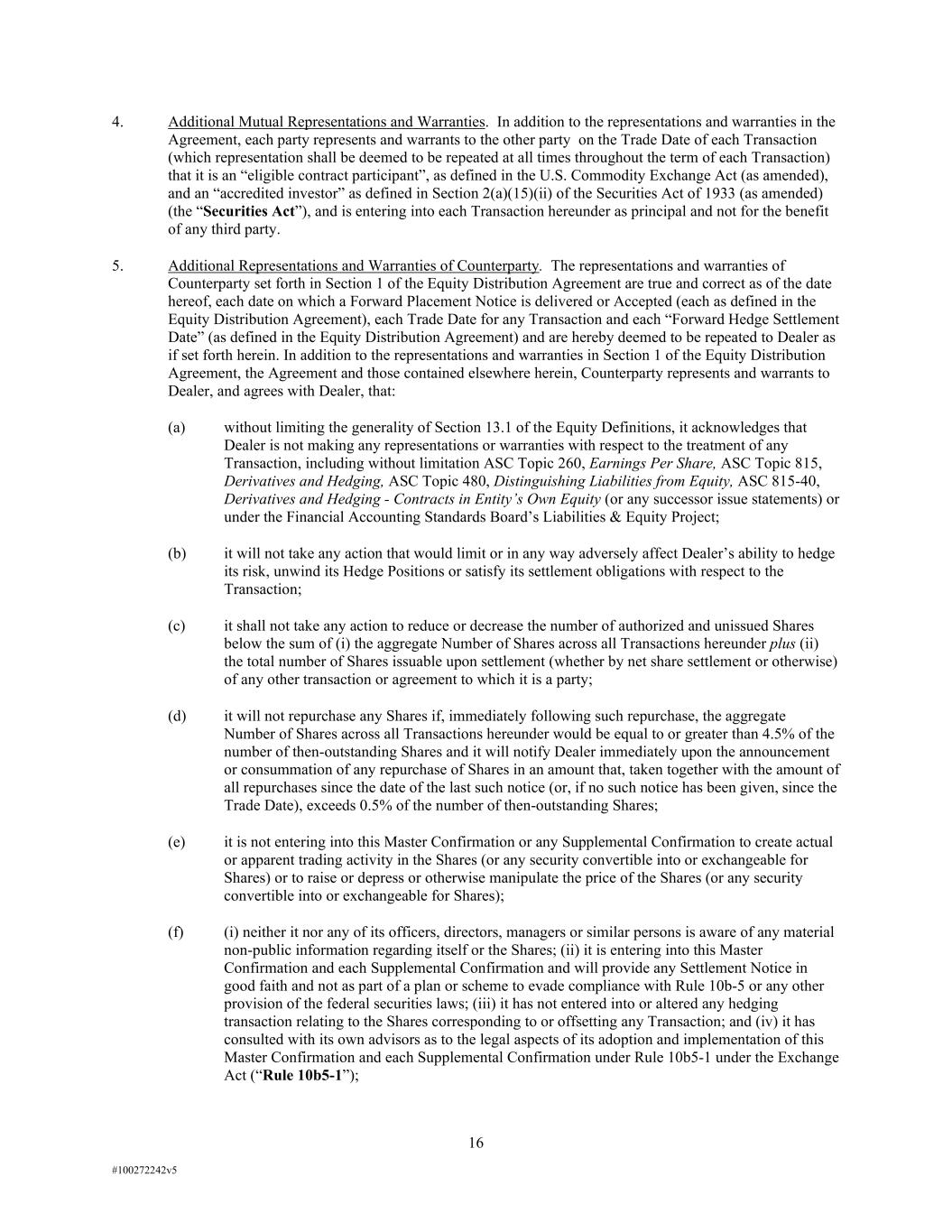 16 # 100272242v5 4。额外的相互陈述和保证。除协议中的陈述和保证外,每一方在每笔交易的交易日期(该陈述应被视为在每笔交易的整个期限内始终重复)向另一方声明并保证,其是美国《商品交易法》(经修订)中定义的“合格合同参与人”,以及1933年《证券法》(经修订)(“证券法”)第2(a)(15)(ii)节中定义的“认可投资者”,并且正在作为委托人而不是为了任何第三方的利益而进行本协议项下的每笔交易。5.交易对手的额外陈述和保证。Equity Distribution协议第1节规定的交易对手方陈述和保证是真实、正确的,截至本协议签署之日、远期配售通知送达或受理的每个日期(每一项定义均在Equity Distribution协议中)、任何交易的每个交易日和每个“远期对冲结算日”(定义见Equity Distribution协议),并在此被视为如同在本协议中规定的那样向交易商重复。除了Equity Distribution协议第1节、该协议以及此处其他地方所载的那些内容中的陈述和保证外,交易对方向交易商声明并保证,并与交易商同意:(a)在不限制Equity定义第13.1节的一般性的情况下,其承认交易商并未就任何交易的处理作出任何陈述或保证,包括但不限于ASC主题260,每股收益,ASC主题815,衍生品和套期保值,TERM0 ASC ASC主题480,区分负债与权益,TERM0 ASC ASC 815-40,衍生品和套期保值-实体自有权益(或任何后续发行报表)中的合同或财务会计准则委员会的负债和权益项目下的合同;(b)不会采取任何会限制或以任何方式对交易商的风险对冲能力产生不利影响的行动,解除其对冲头寸或履行其与交易有关的结算义务;(c)其不得采取任何行动减少或减少授权和未发行的股份数量低于(i)本协议项下所有交易的股份总数加上(ii)其作为一方的任何其他交易或协议在结算时(无论是通过净股份结算或其他方式)可发行的股份总数之和;(d)其将不会回购任何股份,如果在紧随回购之后,本协议项下所有交易的股份总数将等于或大于当时已发行股份数量的4.5%,并将在宣布或完成任何股份回购后立即通知交易商,回购金额连同自上一次此类通知之日(或,如果未发出此类通知,则自交易日期)以来的所有回购金额一起计算,超过当时已发行股份数目的0.5%;(e)订立本主确认书或任何补充确认书不会造成股份(或任何可转换为或可交换为股份的证券)的实际或明显交易活动,或提高、压低或以其他方式操纵股份(或任何可转换为或可交换为股份的证券)的价格;(f)(i)其或其任何高级职员、董事,经理或类似人士知悉有关其本身或股份的任何重大非公开信息;(ii)其正在订立本主确认书及每项补充确认书,并将本着诚意提供任何和解通知,而不是作为规避遵守规则10b-5或联邦证券法任何其他规定的计划或计划的一部分;(iii)其未订立或更改与任何交易对应或抵消的股份有关的任何对冲交易;(iv)就其根据《交易法》(“规则10b5-1”)采用和实施本主确认和每项补充确认的法律方面与其自己的顾问进行了磋商;