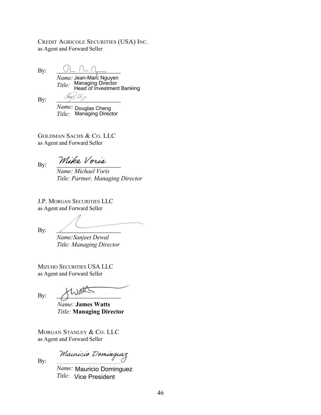 CREDIT AGRICOLE SECURITIES(USA)INC.作为代理和远期卖方作者:Name:Title:By:Name:Title:GOLDMAN SACHS & CO. LLC as Agent and Forward Seller By:J.P. MORGAN SECURITIES LLC as Agent and Forward Seller By:Name:Sanjeet Dewal Title:Managing Director MIZUHO SECURITIES USA LLC as Agent and Forward Seller By:MORGAN STANLEY & CO. LLC as Agent and Forward Seller By:Name:Title:46 Jean-Marc Nguyen Managing Director Head of Investment Banking Douglas Cheng Managing Dire