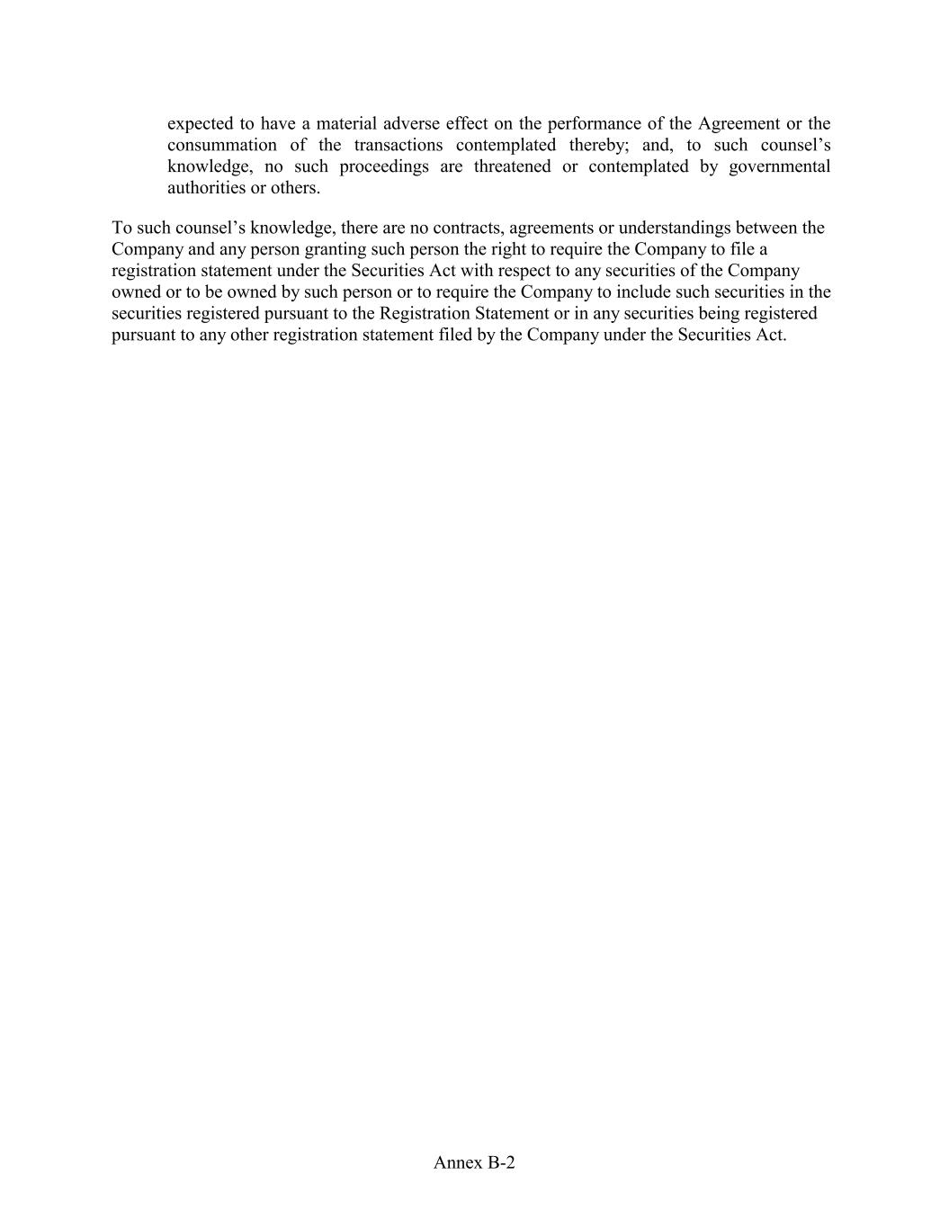预计会对协议的履行或由此设想的交易的完成产生重大不利影响;并且据该律师所知,政府当局或其他人不会威胁或考虑进行此类诉讼。据该律师所知,公司与任何授予该人权利要求公司根据《证券法》就该人拥有或将拥有的公司任何证券提交登记声明或要求公司将该等证券包括在根据登记声明登记的证券中或根据公司根据《证券法》提交的任何其他登记声明登记的任何证券中的人之间没有任何合同、协议或谅解。附件B-2