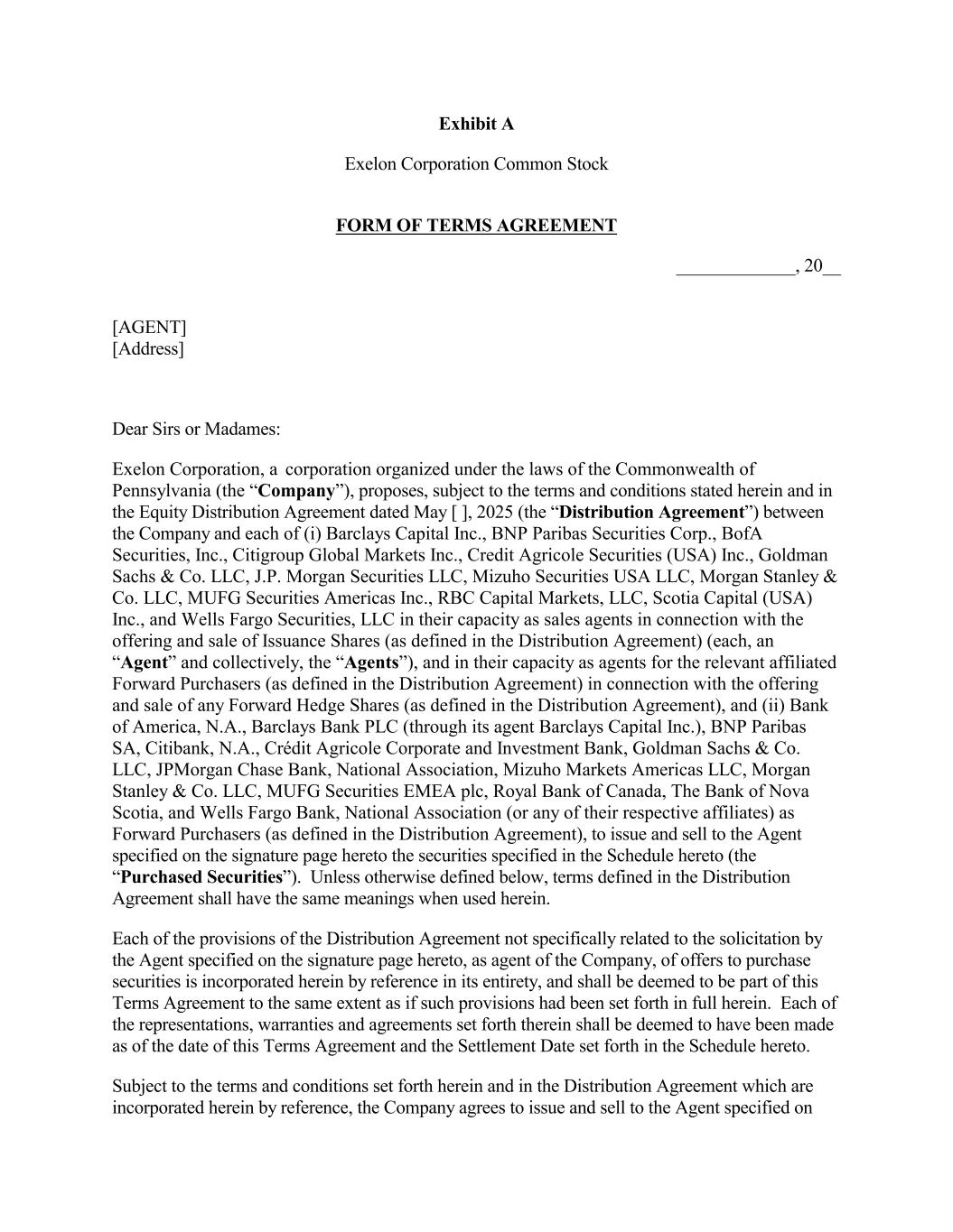附件 A普通股条款格式协议____________,20__ [代理人] [地址]尊敬的先生或女士:爱克斯龙公司,一家根据宾夕法尼亚州联邦法律组建的公司(“公司”),根据此处所述条款和条件以及公司与(i)BARCLAYS CAPITAL INC.、BNP Paribas Securities Corp.、BoFA Securities,Inc.、花旗集团 Global Markets Inc.、Credit Agricole Securities(USA)Inc.、高盛TERMSachs & Co. LLC、J.P. Morgan Securities LLC、MMA摩根士丹利 & Co. LLC、MUFG Securities Americas Inc.、RBC Capital Markets,LLC、Scotia Capital(USA)Inc.和富国银行 Securities,LLC作为与发行股份的发售和销售(定义见分销协议)有关的销售代理(各自为“代理”,统称“代理”),以及作为与发售和销售任何远期对冲股份(定义见分销协议)有关的相关关联远期购买者(定义见分销协议)的代理,以及(ii)美国银行,N.A.,巴克莱银行 PLC(通过其代理人BARCLAYS CAPITAL INC.)、BNP Paribas SA、Citibank,N.A.、Cr é dit Agricole Corporate and Investment Bank、高盛 Sachs & Co. LLC、摩根大通 Bank、National Association、Mizuho Markets Americas LLC、摩根士丹利 & Co. LLC、MUFG Securities EMEA plc、加拿大皇家银行、新斯科舍银行、富国银行银行、National Association(或其各自的任何关联公司)作为远期购买者(定义见分销协议),向本协议签字页指定的代理人发行和销售本协议附表所列证券(“已购买的证券”)。除非下文另有定义,分销协议中定义的术语在此处使用时应具有相同的含义。分销协议中与本协议签署页上指定的代理人(作为公司的代理人)的购买证券要约的招揽没有具体关系的每一项规定均以引用方式整体并入本协议,并应被视为本条款协议的一部分,其程度与本协议已在本协议中完整阐述的此类规定相同。其中所列的每一项陈述、保证和协议均应被视为已于本条款协议日期和本协议附表所列的结算日期作出。在遵守本协议及以引用方式并入本协议的分销协议中规定的条款和条件的情况下,本公司同意向指定的代理发行和销售