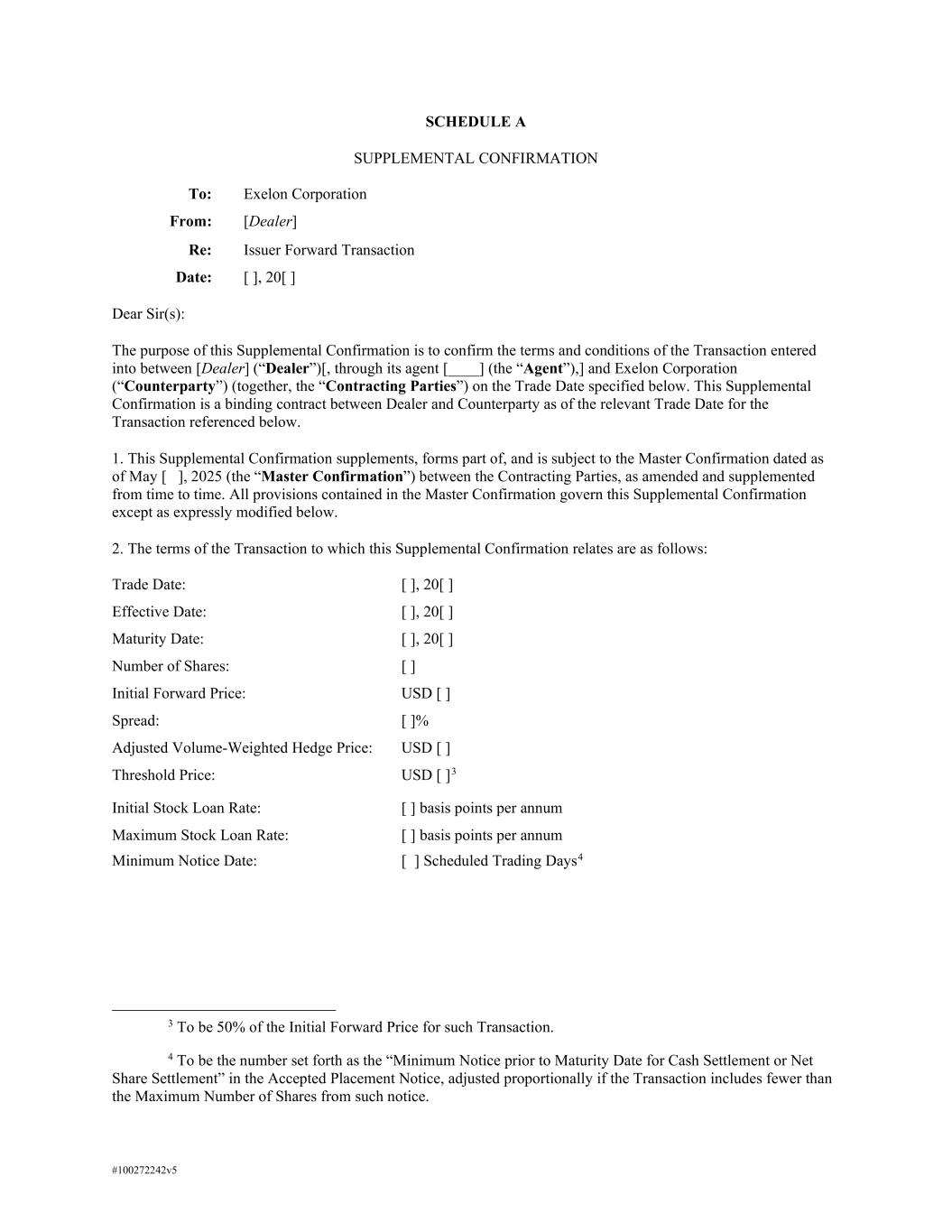 # 100272242v5安排向:爱克斯龙公司进行补充确认from:[ dealer ] re:发行人转发交易日期:[ ],20 [ ]尊敬的先生(s):本补充确认的目的是确认[ dealer ](“dealer”)[,通过其代理人[ ____ ](“代理人”)]与爱克斯龙公司(“交易对手方”)(统称“缔约方”)于下述交易日期订立的交易条款和条件。本补充确认书是交易商与交易对手之间截至下文所指交易的相关交易日的具有约束力的合同。1.本补充确认书补充、构成截至2025年5月[ ]日的总确认书(“总确认书”),并受制于各缔约方之间不时修订和补充的总确认书(“总确认书”)。除下文明确修改外,主确认书中包含的所有条款均适用于本补充确认书。2.本补充确认书所涉及的交易条款如下:交易日期:[ ],20 [ ]生效日期:[ ],20 [ ]到期日期:[ ],20 [ ]股份数量:[ ]初始远期价格:美元[ ]价差:[ ]%调整后的成交量加权对冲价:美元[ ]门槛价:美元[ ] 3初始股票贷款利率:每年[ ]个基点最高股票贷款利率:每年[ ]个基点最低通知日期:[ ]预定交易日43该交易的初始远期价格的50%。4为已接受的配售通知中载列的“现金结算或股份净额结算到期日前最低通知”的数量,如交易包含的股份数量少于该通知的最大数量,则按比例调整。