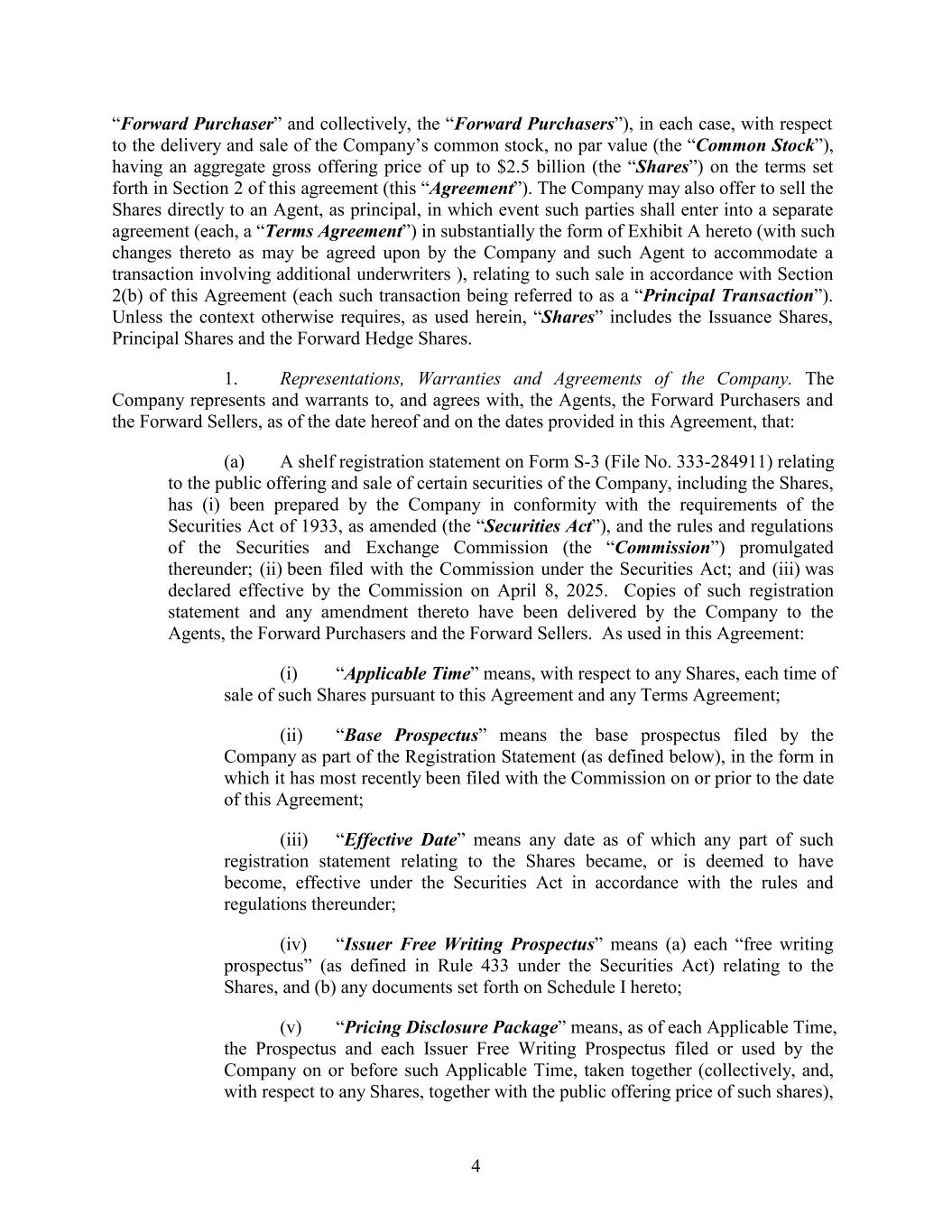 “远期买方”,统称“远期买方”),在每种情况下,就公司普通股的交付和销售而言,没有面值(“普通股”),根据本协议(本“协议”)第2节规定的条款,总发行价格高达25亿美元(“股份”)。公司还可以向作为委托人的代理人直接提出出售股份的要约,在这种情况下,该等各方应根据本协议第2节(b)项就该等出售(每项该等交易称为“主要交易”)订立一份基本上以本协议的附件 A形式的单独协议(连同公司与该代理人为适应涉及额外承销商的交易而可能达成的更改)。除非上下文另有要求,如本文所用,“股份”包括发行股份、本金股份和远期对冲股份。1.公司的陈述、保证和协议。公司向代理人、远期买方和远期卖方声明并保证并同意,截至本协议日期和本协议规定日期,(a)表格S-3(档案编号:333-284911)上有关公开发行和出售公司某些证券(包括股份)的货架登记声明已(i)由公司按照经修订的1933年《证券法》(“证券法”)的要求编制,及证券交易委员会(“证监会”)据此颁布的规则及条例;(ii)已根据《证券法》向证监会备案;及(iii)已于2025年4月8日由证监会宣布生效。该登记声明的副本及其任何修订已由公司交付给代理、远期买方和远期卖方。如本协议所用:(i)就任何股份而言,“适用时间”是指根据本协议和任何条款协议出售该等股份的每次时间;(ii)“基本招股章程”是指公司作为注册声明(定义见下文)的一部分提交的基本招股章程,其格式是最近在本协议日期或之前向委员会提交的;(iii)“生效日期”是指该等与股份有关的注册声明的任何部分成为或被视为已成为的任何日期,(iv)“发行人自由撰写招股章程”指(a)每份与股份有关的“自由撰写招股章程”(定义见《证券法》第433条),及(b)本协议附表一所列的任何文件;(v)“定价披露包”指,截至每个适用时间,公司于该适用时间或之前提交或使用的招股章程及每份发行人自由撰写招股章程合在一起(统称,就任何股份而言,连同该等股份的公开发售价格),4