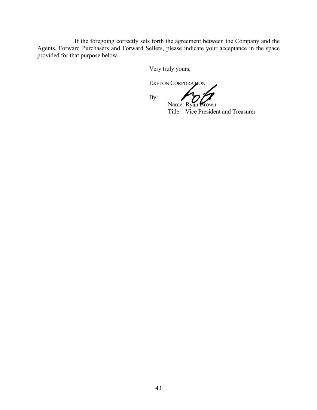 43如果上述内容正确地阐述了公司与代理、远期买方和远期卖方之间的协议,请在下面为此目的提供的空格中注明您的接受。Very truly yours,EXELON CORPORATION by:Name:Ryan Brown title:Vice President and Treasurer