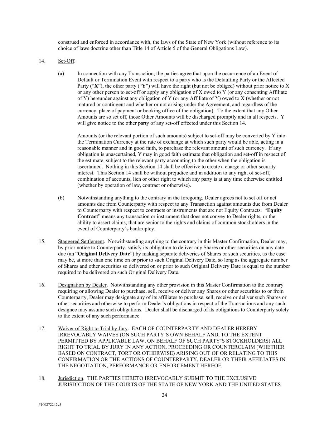 24 # 100272242v5根据纽约州法律解释和执行(不参考《一般义务法》第5条第14条以外的其法律选择原则)。14.抵销。(a)就任何交易而言,各方同意,一旦发生与作为违约方或受影响方的一方有关的违约事件或终止事件(“X”),另一方(“Y”)将有权(但无义务)在不事先通知X或任何其他人的情况下,抵销或适用X在本协议项下欠Y(或Y的任何同意的关联公司)的任何义务,以抵销Y(或Y的任何关联公司)欠X的任何义务(无论是否到期或或有,以及是否根据协议产生,且无论该义务的货币、付款地或订票处)。在如此抵销任何其他金额的情况下,这些其他金额将在所有方面迅速解除。Y会将根据本第14条实施的任何抵销通知另一方。须予抵销的金额(或该等金额的有关部分)可由Y按该方能够以合理方式和善意行事以购买该等货币的有关金额的汇率转换为终止货币。如果任何义务未被确定,Y可以善意地估计该义务并就该估计进行抵销,但须在确定该义务时由相关方对另一方进行会计处理。本条第14款的任何规定均不具有设定押记或其他担保权益的效力。本条第14款在不影响任何一方当事人在任何时候(不论是通过法律、合同或其他方式)有权享有的任何抵销权、账户合并、留置权或其他权利之外,均不构成损害。(b)尽管上述有任何相反的规定,交易商同意不将任何交易的交易对手应支付的金额与非股权合同的合同或票据的交易对手应支付的金额进行抵销或净额抵销。“股权合同”是指在交易对手破产的情况下,任何不向交易商转让优先于普通股股东权利和债权的权利或主张债权的能力的交易或工具。15.交错结算。尽管本主确认书另有相反规定,交易商可藉事先通知交易对方,在任何到期日期(“原始交付日期”)履行其交付任何股份或其他证券的义务,方法是在该原始交付日期或之前(视属何情况而定)进行多于一次的股份或此类证券的单独交付,只要在该原始交付日期或之前如此交付的股份和其他证券的总数等于在该原始交付日期要求交付的数量。16.经销商指定。尽管本主确认书中有任何其他相反规定要求或允许交易商向交易对手购买、出售、接收或交付任何股份或其他证券,交易商仍可指定其任何关联公司购买、出售、接收或交付此类股份或其他证券,并以其他方式履行交易商就交易承担的义务,任何此类指定人可承担此类义务。交易商应仅在任何此类履行的范围内解除其对交易对手的义务。17.放弃陪审团审判权。每一对应方和交易商在此不可撤销地放弃(代表该对应方自己,并在适用法律允许的范围内,代表该对应方的股东)在任何诉讼、诉讼程序或反索赔(无论是基于合同、侵权或其他)中由本确认或该对应方、交易商的行动产生或与之相关的所有权利18.管辖权。此处的当事人不可撤销地提交纽约州和美国法院的专属管辖权