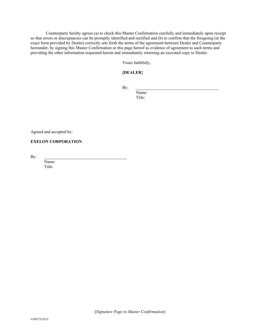 [签署页到主确认] # 100272242v5交易对手特此同意(a)在收到本主确认书后立即仔细检查,以便能够迅速识别和纠正错误或差异;以及(b)通过签署本主确认书或本协议的本页作为同意此类条款的证据并提供本协议要求的其他信息并立即将已签署的副本退回给交易商,确认上述内容(以交易商提供的确切格式)正确地阐述了交易商与交易对手之间在本协议项下的协议条款。您的忠实,[经销商]由:姓名:标题:同意并接受:ExXELON CORPORATION由:姓名:标题: