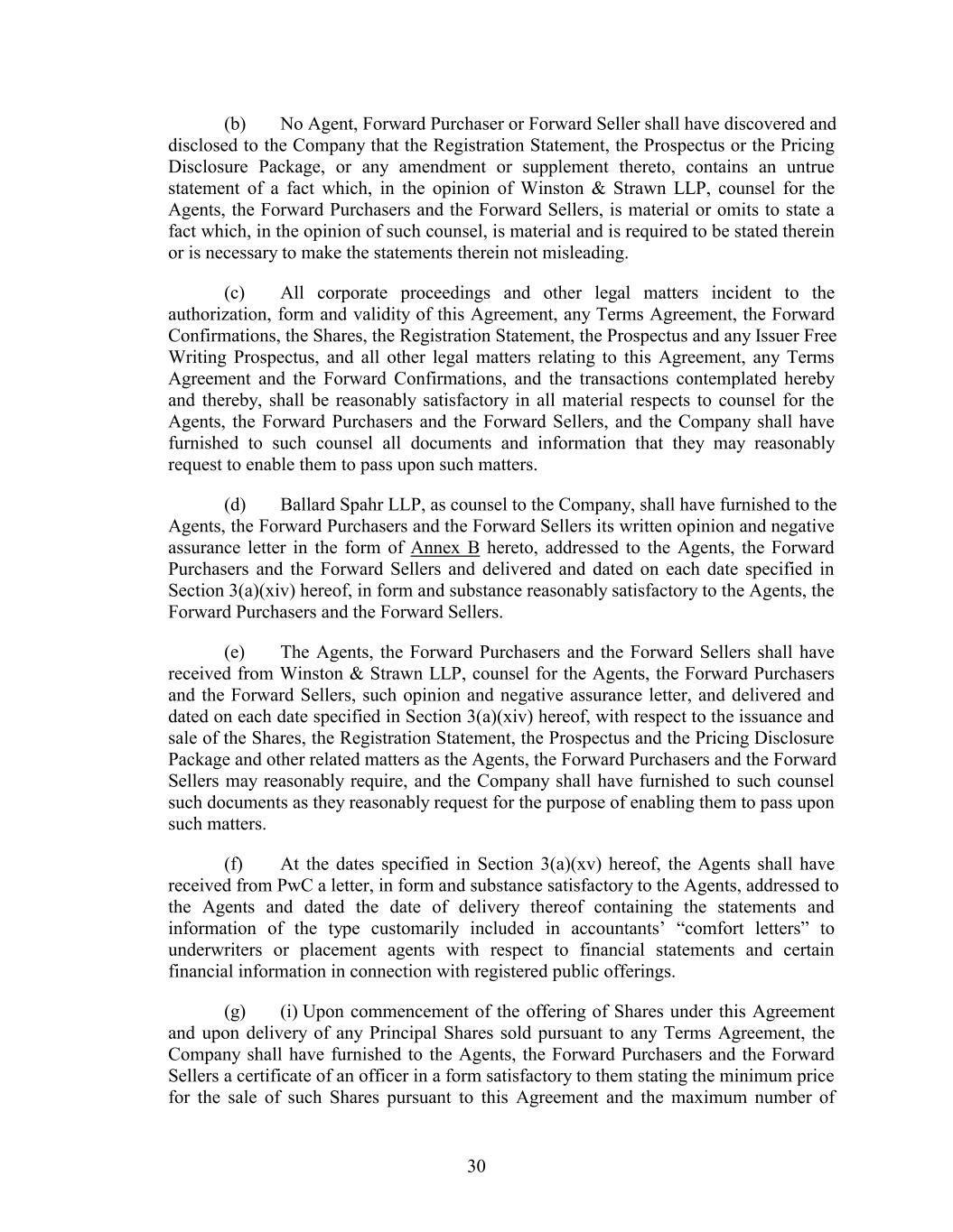 (b)任何代理人、远期买方或远期卖方均不得发现并向公司披露注册声明、招股说明书或定价披露包,或其任何修订或补充,包含对某一事实的不真实陈述,而该事实在Winston & Strawn LLP(代理、远期买方和远期卖方的法律顾问)看来是重要的或遗漏陈述的事实,而该事实在该律师看来是重要的,需要在其中陈述或为使其中的陈述不具误导性而必要。(c)与本协议、任何条款协议、远期确认书、股份、登记声明、招股章程及任何发行人免费书面招股章程的授权、形式及有效性有关的所有公司程序及其他法律事项,以及与本协议、任何条款协议及远期确认书有关的所有其他法律事项,以及在此及由此设想的交易,均应在所有重大方面合理地令代理、远期买方和远期卖方的法律顾问满意,及公司应已向该大律师提供他们可能合理要求的所有文件和资料,以使他们能够就该等事项进行传递。(d)Ballard Spahr LLP作为公司的大律师,应以本协议附件B的形式向代理、远期买方和远期卖方提供其书面意见和否定保证函,发给代理、远期买方和远期卖方,并在本协议第3(a)(xiv)节规定的每个日期交付并注明日期,其形式和实质均令代理、远期买方和远期卖方合理满意。(e)代理、远期买方和远期卖方应已收到Winston & Strawn LLP、代理的法律顾问、远期买方和远期卖方的意见和否定保证函,并已于本协议第3(a)(xiv)节规定的每个日期交付并注明日期,涉及代理、远期买方和远期卖方可能合理要求的股份发行和销售、登记声明、招股说明书和定价披露包及其他相关事项,及公司须已向该等大律师提供他们合理要求的文件,以使他们能够就该等事宜作出传递。(f)在本协议第3(a)(xv)节规定的日期,代理应已收到普华永道发给代理的一封信函,其形式和实质均令代理满意,并注明日期,其中载有会计师就财务报表和与注册公开发行有关的某些财务信息向承销商或配售代理发出的“安慰函”中通常包含的类型的报表和信息。(g)(i)在开始根据本协议发售股份时及在交付根据任何条款协议出售的任何本金股份时,公司须已向代理、远期买方及远期卖方提供一份高级人员证明书,其格式须令他们满意,述明根据本协议出售该等股份的最低价格及最多30