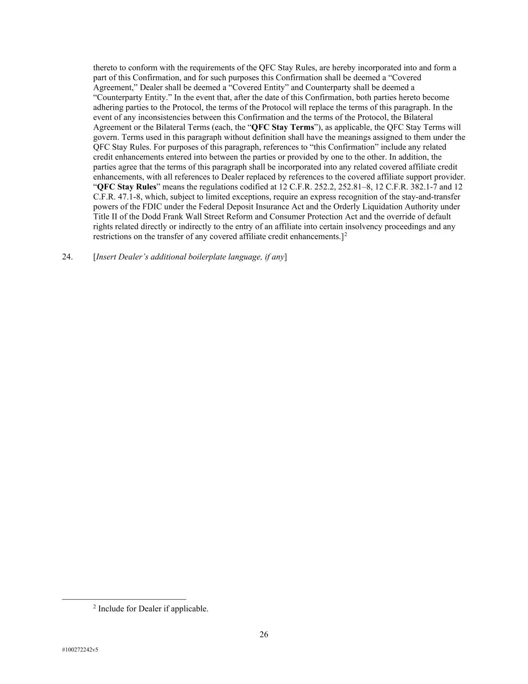 26 # 100272242v5以符合QFC中止规则的要求,特此纳入并构成本确认书的一部分,为此目的,本确认书应被视为“涵盖协议”,交易商应被视为“涵盖实体”,交易对手应被视为“交易对手实体”。如果在本确认之日之后,本协议双方成为《议定书》的遵守方,则《议定书》的条款将取代本款的条款。如本确认书与《议定书》、《双边协定》或《双边条款》(各自称为“QFC中止条款”)(如适用)的条款有任何不一致之处,则以《QFC中止条款》为准。本款所用未作定义的用语,具有《QFCStay规则》赋予的含义。就本段而言,提及“本确认”包括各方之间订立或由一方向另一方提供的任何相关信用增级。此外,各方同意,本款条款应被纳入任何相关的涵盖关联信用增强中,所有对交易商的提及均被对涵盖关联支持提供商的提及所取代。“QC中止规则”是指编纂于12 C.F.R. 25 2.2、252.81 – 8、12 C.F.R. 382.1-7和12 C.F.R. 47.1-8的规定,除有限的例外情况外,这些规定要求明确承认FDIC根据《联邦存款保险法》和《多德弗兰克华尔街改革和消费者保护法》标题II下的有序清算机构的停留和转移权力,以及直接或间接与关联公司进入某些破产程序相关的违约权的覆盖,以及对任何涵盖的关联公司信用增强转让的任何限制。] 224。[插入经销商的额外样板语言,如果有] 2包括为经销商如果适用。