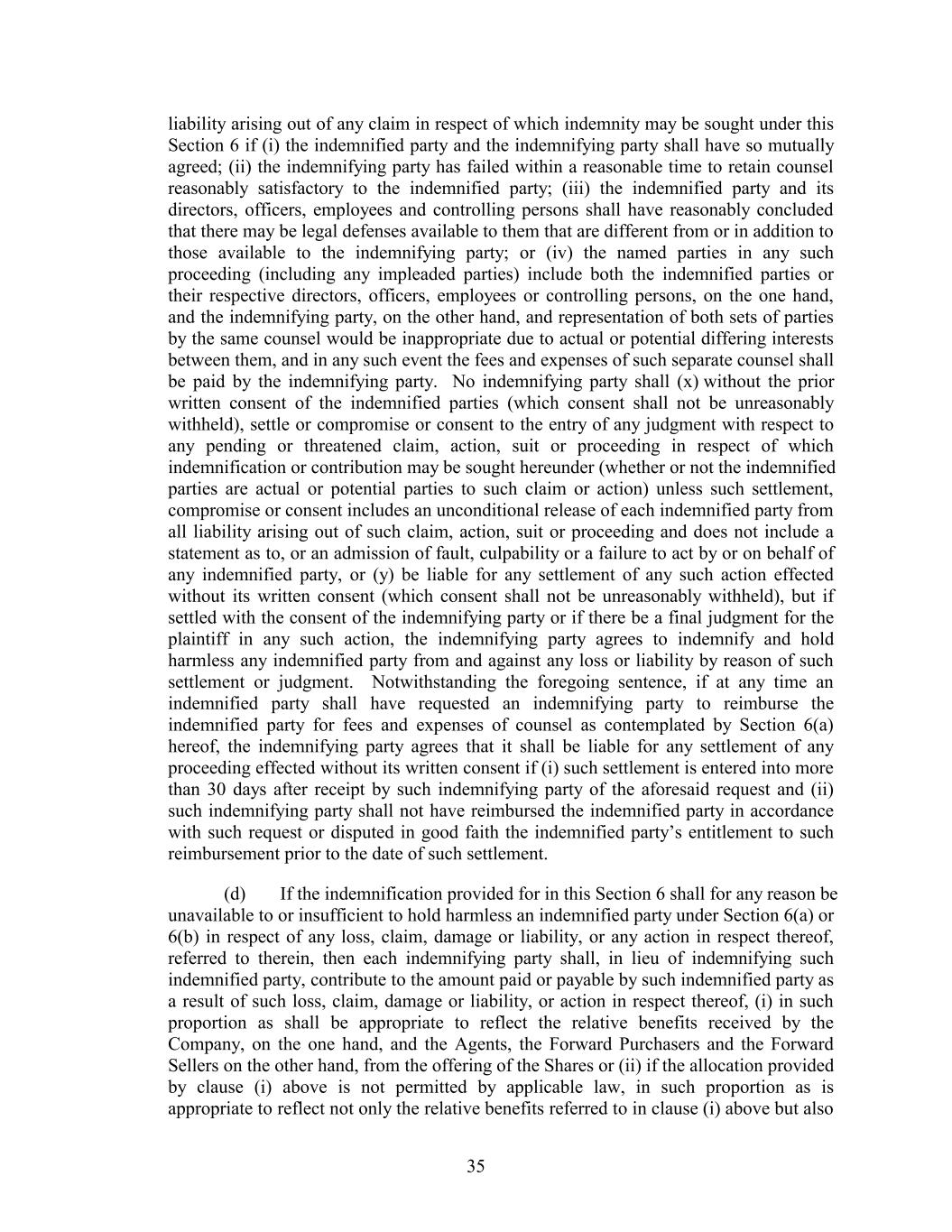 因任何可根据本条寻求赔偿的申索而产生的法律责任,如(i)获弥偿方与获弥偿方须如此相互同意;(ii)获弥偿方未能在合理时间内聘请获弥偿方合理满意的大律师;(iii)获弥偿方及其董事、高级人员,雇员和控制人应已合理得出结论,他们可能有不同于赔偿方可获得的法律抗辩或在其之外可获得的法律抗辩;或(iv)任何该等程序中的指名当事人(包括任何受牵连的当事人)一方面包括受赔偿方或其各自的董事、高级职员、雇员或控制人,另一方面包括赔偿方,并且由于他们之间实际或潜在的不同利益,由同一律师代表两组当事人将是不合适的,在任何此种情况下,该独立律师的费用和开支应由赔偿方支付。任何赔偿方不得(x)未经受赔偿方事先书面同意(不得无理拒绝同意),就任何可能根据本协议寻求赔偿或分担的未决或威胁索赔、诉讼、诉讼或程序达成和解或妥协或同意进入任何判决(无论受赔偿方系该索赔或诉讼的实际或潜在当事人),除非该和解、妥协或同意包括无条件免除每一受赔偿方因该索赔、诉讼而产生的所有责任,诉讼或法律程序,并不包括关于任何获弥偿方的陈述,或承认过失、有罪不罚或未能由任何获弥偿方或代表任何获弥偿方行事,或(y)须就未经其书面同意(不得无理拒绝同意)而实施的任何该等诉讼的任何和解承担法律责任,但如经弥偿方同意而解决,或如在任何该等诉讼中对原告作出最终判决,赔偿一方同意赔偿任何被赔偿一方,并使其免受因此类和解或判决而造成的任何损失或责任。尽管有上述判决,如在任何时候,获弥偿方应已要求获弥偿方偿还本条例第6(a)条所设想的律师费及开支,赔偿一方同意,如(i)该赔偿一方在收到上述请求后超过30天订立该和解,且(ii)该赔偿一方在该和解日期之前未根据该请求向被赔偿方作出补偿或善意争议该受赔偿方获得该补偿的权利,则该赔偿一方应对未经其书面同意而进行的任何程序的任何和解承担责任。(d)如本条第6条所规定的赔偿因任何理由而不能或不足以使根据第6(a)或6(b)条就其中所提述的任何损失、申索、损害或赔偿责任,或就该等损失、申索、损害或赔偿责任的任何诉讼而使获弥偿方免受损害,则每一获弥偿方须就该获弥偿方因该等损失、申索、损害或赔偿责任,或就该等诉讼而已支付或须支付的款额,以代替对该获弥偿方作出弥偿,(i)按适当的比例,一方面反映公司从发售股份中获得的相对利益,另一方面反映代理、远期买方和远期卖方,或(ii)如适用法律不允许上述第(i)条提供的分配,则按适当的比例,不仅反映上述第(i)条提及的相对利益,而且还反映35