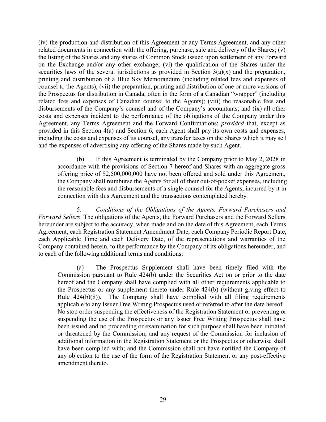 (iv)制作和分发本协议或任何条款协议,以及与股份的发售、购买、出售和交付有关的任何其他相关文件;(v)在交易所和/或任何其他交易所结算任何远期交易时发行的股份和任何普通股股份的上市;(vi)根据第3(a)(x)节规定的若干司法管辖区证券法的股份资格,以及编制、印刷和分发蓝天备忘录(包括向代理提供法律顾问的相关费用和开支);(vii)编制,印刷和分发一个或多个版本的招股说明书以在加拿大分发,通常以加拿大“包装纸”的形式(包括加拿大法律顾问对代理的相关费用和开支);(viii)公司法律顾问和公司会计师的合理费用和支出;(ix)与公司履行本协议、任何条款协议和远期确认书项下的义务有关的所有其他成本和开支;但除本第4(a)和第6节规定外,各代理应自行支付成本和开支,包括其法律顾问的成本和费用、其可能出售的股份的任何转让税以及该代理进行的任何股份发售的广告费用。(b)如果本协议在2028年5月2日之前由公司根据本协议第7条的规定终止,且未根据本协议提供和出售总发行价格为2,500,000,000美元的股份,则公司应偿还代理因本协议和本协议所设想的交易而产生的所有自付费用,包括为代理提供单一律师的合理费用和支出。5.代理、远期买方和远期卖方义务的条件。代理、远期买方和远期卖方在本协议项下的义务受制于本协议、每份条款协议、每份登记声明修订日期、每份公司定期报告日期、每份适用时间和每份交付日期对本公司履行其在本协议项下义务的准确性,以及以下每一项附加条款和条件:(a)招股章程补充文件应在本文件日期当日或之前根据《证券法》第424(b)条及时提交给委员会,且公司应已遵守根据第424(b)条适用于招股章程或其任何补充文件的所有其他要求(不影响第424(b)(8)条)。公司应已遵守适用于本协议日期之后使用或提及的任何发行人自由撰写招股说明书的所有备案要求。不得已发出停止令以暂停注册声明的有效性或阻止或暂停使用招股章程或任何发行人自由书写招股章程,且不得已由监察委员会为此目的发起或威胁进行任何程序或审查;及监察委员会提出的在注册声明或招股章程中列入额外资料或以其他方式的任何要求,均不得已获遵从;而监察委员会不得已将任何反对使用注册声明表格或任何生效后修订通知公司。29