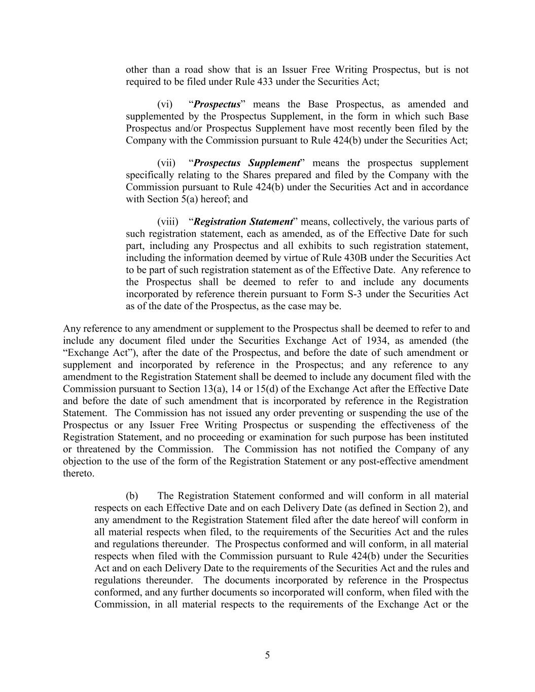 除路演为发行人自由编写招股说明书,但根据《证券法》第433条规则无需备案;(vi)“招股说明书”指经招股说明书补充文件修订和补充的基本招股说明书,以该等基本招股章程及/或招股章程补充文件最近由公司根据《证券法》第424(b)条向委员会提交的格式;(vii)“招股章程补充文件”指具体涉及公司根据《证券法》第424(b)条并根据本协议第5(a)节向委员会编制和提交的股份的招股章程补充文件;(viii)“注册声明”统称为该注册声明的各个部分,每个部分均经修订,截至该部分的生效日期,包括任何招股说明书和此类登记声明的所有证据,包括根据《证券法》第430B条被视为自生效之日起属于此类登记声明一部分的信息。对招股说明书的任何提及均应被视为提及并包括截至招股说明书日期(视情况而定)根据《证券法》下的表格S-3以引用方式并入其中的任何文件。凡提述对招股章程的任何修订或补充,均应视为提述并包括根据经修订的1934年《证券交易法》(“交易法”)、在招股章程日期之后以及在该等修订或补充日期之前提交并以引用方式并入招股章程的任何文件;凡提述对注册声明的任何修订,均应视为包括根据第13(a)节向委员会提交的任何文件,《交易法》第14或15(d)条在生效日期之后和以引用方式并入注册声明的此类修订日期之前。证监会并无发出任何命令,阻止或暂停使用招股章程或任何发行人自由撰写招股章程或暂停注册声明的有效性,亦无证监会为此目的提起或威胁进行任何程序或审查。监察委员会并无就使用注册声明表格或任何生效后修订通知公司。(b)注册声明在每个生效日期和每个交付日期(如第2节所定义)符合并将在所有重大方面符合,在本协议日期之后提交的注册声明的任何修订在提交时将在所有重大方面符合《证券法》及其下的规则和条例的要求。招股说明书在根据《证券法》第424(b)条向委员会提交时和在每个交割日均符合并将在所有重大方面符合《证券法》及其规则和条例的要求。以引用方式并入招股说明书的文件符合规定,如此并入的任何进一步文件在提交给委员会时,将在所有重大方面符合《交易法》或《5