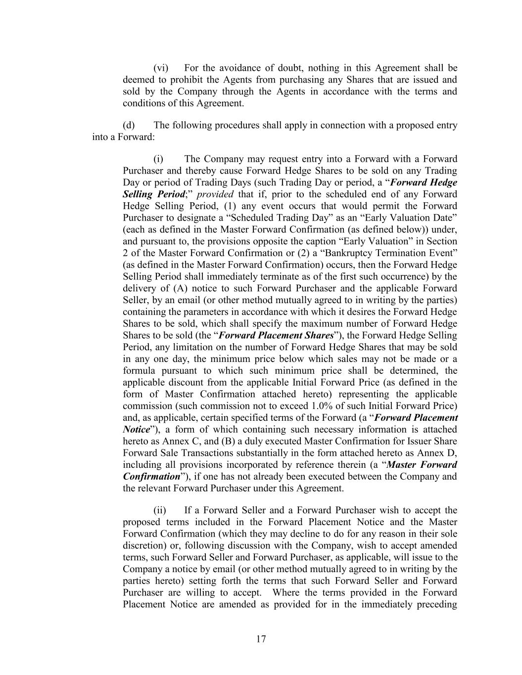 (vi)为免生疑问,本协议中的任何内容均不得视为禁止代理购买公司根据本协议的条款和条件通过代理发行和出售的任何股份。(d)就拟议订立远期合约而言,应适用以下程序:(i)公司可要求与远期买方订立远期合约,从而导致在任何交易日或交易日期间(该交易日或期间,称为“远期对冲卖出期;”)出售远期对冲股份,但前提是,如果在任何远期对冲卖出期的预定结束之前,(1)根据并依据总远期确认书第2节中“提前估值”标题相对的规定或(2)发生“破产终止事件”(定义见总远期确认书),允许远期买方指定“预定交易日”为“提前估值日期”(每一项定义见总远期确认书(定义见下文))的任何事件发生,则远期对冲卖出期应通过向该远期买方和适用的远期卖方交付(a)通知自第一次发生时起立即终止,以载有其希望出售远期对冲股份所依据的参数的电子邮件(或各方共同书面同意的其他方式),其中应指明将出售的远期对冲股份的最大数量(“远期配售股份”)、远期对冲出售期限、对任何一天内可能出售的远期对冲股份数量的任何限制、不得进行出售的最低价格或据此确定该最低价格的公式,代表适用佣金(该佣金不超过该初始远期价格的1.0%)和(如适用)远期的某些特定条款(“远期配售通知”)的适用初始远期价格(定义见本协议所附的主确认书)的适用折扣,其中包含该必要信息的表格作为附件C附于本协议,以及(b)一份正式签署的发行人股份远期销售交易的主确认书,其形式基本上为附件D所附的表格,包括以引用方式并入其中的所有条款(“主远期确认书”),如公司与相关远期买方之间尚未在本协议项下执行一项。(ii)如果远期卖方和远期买方希望接受远期配售通知和总远期确认书中包含的拟议条款(他们可全权酌情以任何理由拒绝这样做),或在与公司讨论后希望接受经修订的条款,该远期卖方和远期买方(如适用)将通过电子邮件(或双方以书面形式共同同意的其他方式)向公司发出通知,其中载列该远期卖方和远期买方愿意接受的条款。凡远期配售通知书所载条款按紧接前17条的规定修订