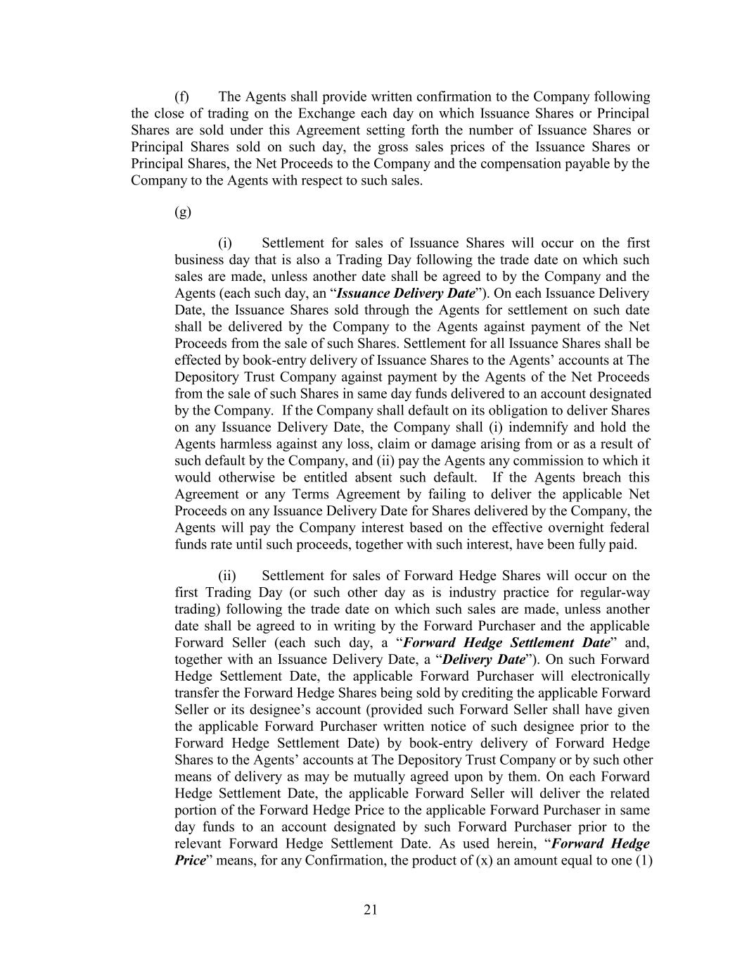 (f)代理须于根据本协议出售发行股份或本金股份的每日交易所收市后向公司提供书面确认,列明于该日出售的发行股份或本金股份的数目、发行股份或本金股份的销售总价、公司所得款项净额及公司就该等出售应付予代理的补偿。(g)(i)销售发行股份的结算将于作出该等销售的交易日期后的第一个营业日进行,但公司与代理须议定另一日期(每一该等日期为“发行交割日”)除外。在每个发行交割日,通过代理机构在该日期出售以进行结算的发行股份,由公司以出售该等股份所得款项净额的款项交付给代理机构。所有发行股份的结算,以发行股份记账式交付至存托信托公司代理账户的方式进行,由代理支付当日资金交付至公司指定账户的出售该等股份所得款项净额。如果公司在任何发行交割日未能履行其交付股份的义务,公司应(i)就公司因该违约而产生或因该违约而产生的任何损失、索赔或损害向代理作出赔偿并使其免受损害,以及(ii)向代理支付其在没有该违约的情况下本应有权获得的任何佣金。如果代理违反本协议或任何条款协议,未能在公司交付的股票的任何发行交割日交付适用的净收益,代理将根据有效的隔夜联邦基金利率向公司支付利息,直到该等收益连同该等利息全部支付完毕。(ii)远期对冲股份的销售结算将发生在进行此类销售的交易日期之后的第一个交易日(或常规交易的行业惯例的其他日期),除非远期买方和适用的远期卖方应以书面形式同意另一个日期(每个该等日期为“远期对冲结算日”,连同发行交割日为“交割日”)。在该远期对冲结算日,适用的远期买方将通过记账式将远期对冲股份交付至代理在存托信托公司的账户或通过他们可能共同商定的其他交付方式,通过记入适用的远期卖方或其指定人账户(前提是该远期卖方应已在远期对冲结算日之前向该指定人的适用远期买方发出书面通知)的方式,以电子方式转让正在出售的远期对冲股份。在每个远期对冲结算日,适用的远期卖方将把远期对冲价格的相关部分以当日资金交付给适用的远期买方,并在相关远期对冲结算日之前交付给该远期买方指定的账户。如本文所用,“远期对冲价格”是指,对于任何确认,(x)的乘积等于一(1)21