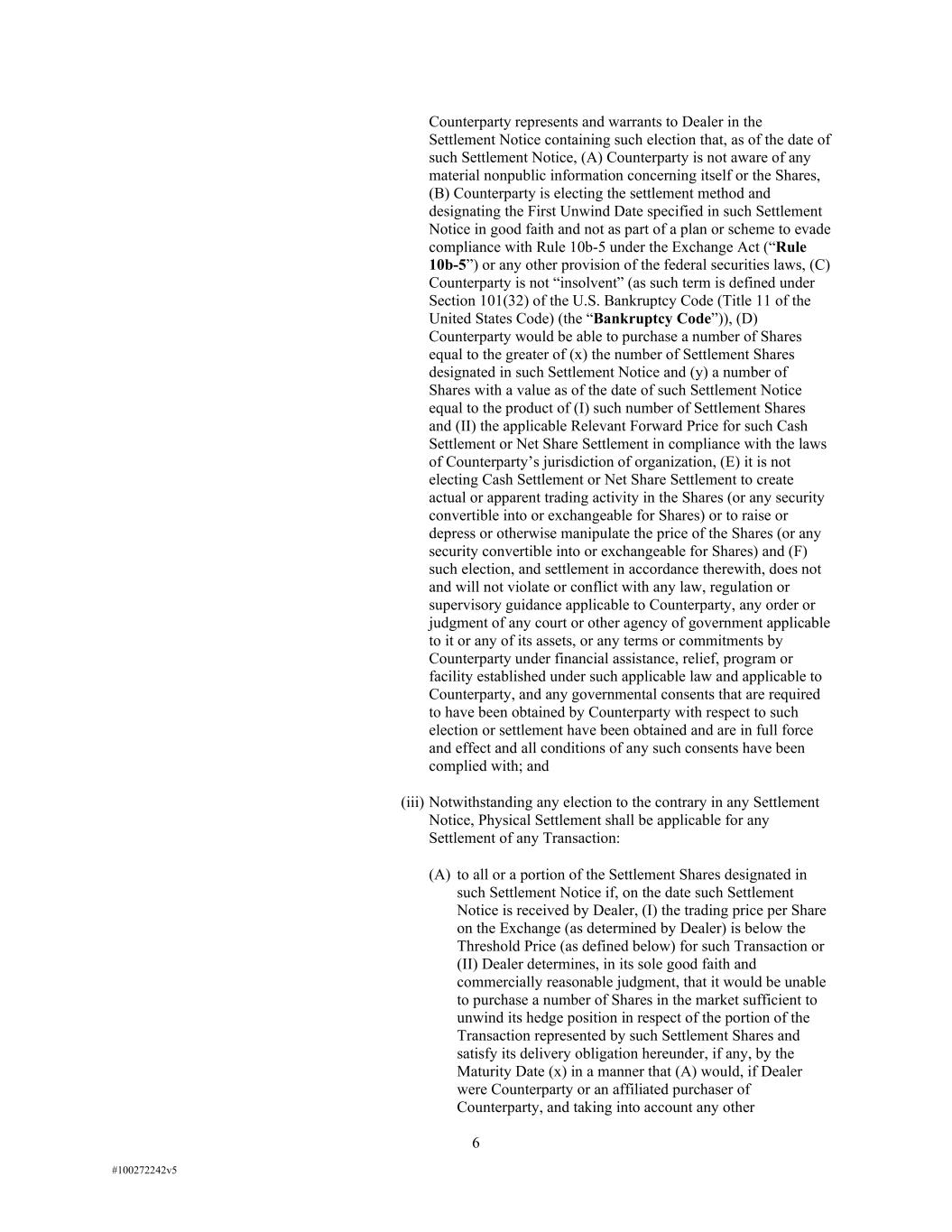 6 # 100272242v5交易对手在包含此类选择的和解通知中向交易商声明并保证,截至该和解通知发布之日,(a)交易对手并不知悉任何有关其自身或股份的重大非公开信息,(b)交易对手是出于善意选择该和解方法并指定该和解通知中指定的第一个解除交易日期,而不是作为规避遵守《交易法》(“规则10b-5”)或联邦证券法任何其他条款的计划或计划的一部分,(c)交易对手不是“资不抵债”(因为该术语是根据《美国破产法》(美国法典第11章)第101(32)条(“破产法”)定义的),(d)交易对手方将能够购买数量等于(x)该结算通知中指定的结算股份数量和(y)截至该结算通知之日价值等于(i)该结算股份数量和(II)该现金结算或净股份结算的适用相关远期价格的乘积的较大者的股份,符合交易对手方组织管辖权的法律,(e)其不是选择现金结算或净股份结算来制造股份(或任何可转换为或可交换股份的证券)的实际或明显交易活动,或提高或压低或以其他方式操纵股份(或任何可转换为或可交换股份的证券)的价格,以及(f)该选择以及根据该选择进行的结算,不违反或将不会违反适用于交易对手的任何法律、法规或监管指引、适用于其或其任何资产的任何法院或其他政府机构的任何命令或判决,或交易对手根据根据该等适用法律设立并适用于交易对手的财务援助、救济、方案或设施作出的任何条款或承诺,以及交易对手就该等选择或和解所需取得的任何政府同意,均已取得并具有充分的效力和效力,且任何该等同意的所有条件均已获遵守;及(iii)尽管任何和解通知中有任何相反的选择,实物结算适用于任何交易的任何结算:(a)如在交易商收到该结算通知之日,(i)交易所的每股交易价格(由交易商确定)低于该交易的门槛价(定义见下文),或(ii)交易商根据其完全善意和商业上合理的判断确定,其将无法在市场上购买足够数量的股份,以在到期日(x)之前解除其就该等结算股份所代表的交易部分的对冲头寸并履行其在本协议项下的交割义务(如有),其方式是(a)如果交易商是交易对手或交易对手的关联购买者,并考虑到任何其他