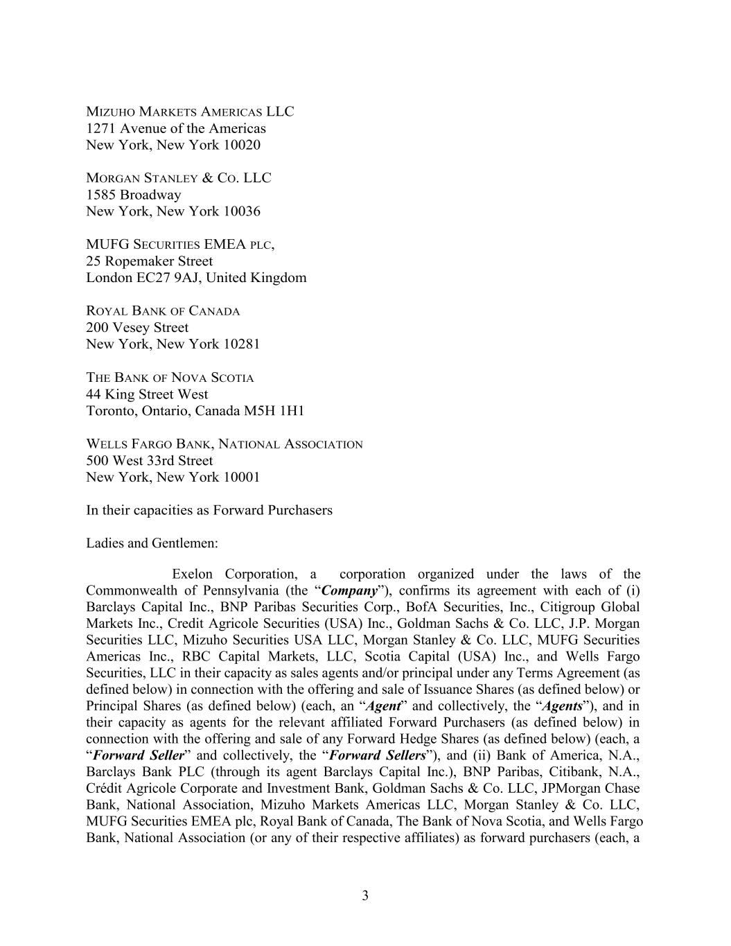 MIZUHO Markets AMERICAS LLC 1271 Avenue of the Americas New York,New York 10020 MORGAN STANLEY & CO. LLC 1585 Broadway New York,New York 10036 MUFG SECURITIES EMEA PLC,25 Ropemaker Street London EC27 9AJ,United Kingdom ROYAL BANK of Canada 200 Vesey Street New York,New York 10281 The BANK of NOVA Scotia 44 King Street West Toronto,Ontario,Canada M5H 1H1 Wells Fargo BANK,NATIONAL ASCIATION 500 West 33rd Street New York,New York 10001以远期购买者身份女士们先生们:爱克斯龙公司 Corporation,一家根据宾夕法尼亚州联邦法律组建的公司(“公司”),确认其与(i)BARCLAYS CAPITAL INC.、法国巴黎证券公司、美国银行证券公司、花旗集团 Global Markets Inc.、法国农业信贷证券(美国)公司、高盛 Sachs & Co. LLC、J.P. Morgan Securities LLC、瑞穗证券美国有限责任公司、摩根士丹利 & Co. LLC、MUFG Securities Americas Inc.、RBC Capital Markets,LLC、Scotia Capital(USA)Inc.、富国银行 Securities,LLC作为与发行股份(定义见下文)或主要股份(定义见下文)的发售和销售有关的任何条款协议(定义见下文)下的销售代理和/或委托人(各自为“代理”,统称“代理”),并以与任何远期对冲股份(定义见下文)的发售和销售有关的相关关联远期买方(定义见下文)的代理人身份(各自为“远期卖方”,统称“远期卖方”),以及(ii)Bank of America,N.A.、巴克莱银行 PLC(通过其代理人丨巴克莱资本公司)、法国巴黎银行、花旗银行,N.A.、Cr é dit Agricole Corporate and Investment Bank、高盛 Sachs & Co. LLC、摩根大通银行、National Association、Mizuho Markets Americas LLC、摩根士丹利 & Co. LLC、MUFG Securities EMEA plc、加拿大皇家银行、新斯科舍银行、富国银行银行、National Association(或其各自的任何关联公司)作为远期购买者(每个3