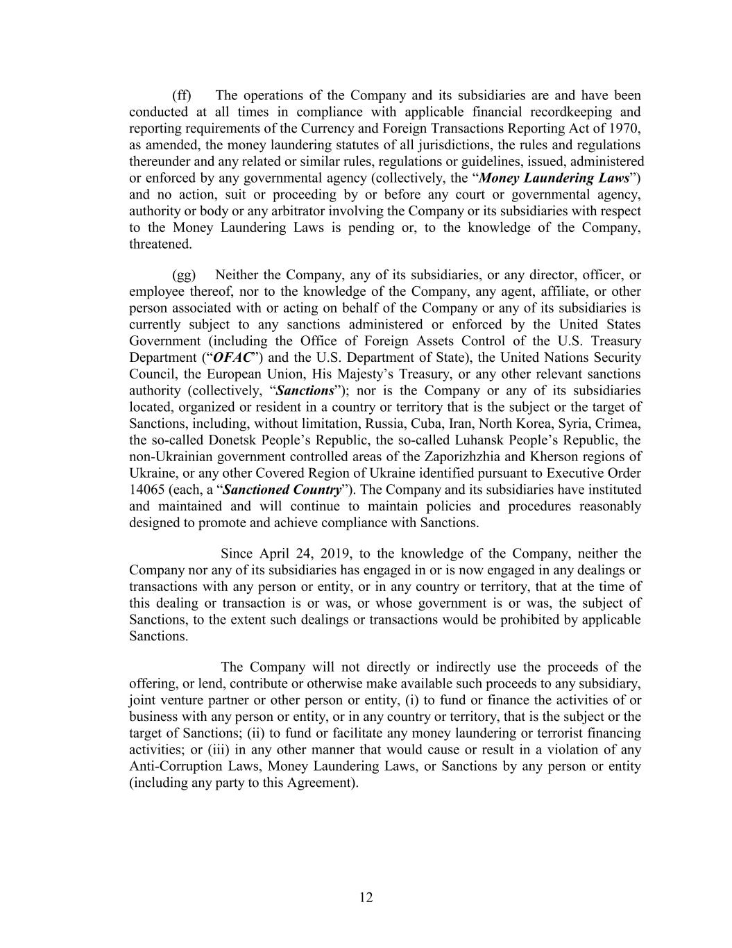 (ff)公司及其附属公司的业务在任何时候都遵守经修订的1970年《货币和外国交易报告法》的适用财务记录保存和报告要求、所有法域的洗钱法规、其下的规则和条例以及任何政府机构发布、管理或执行的任何相关或类似的规则、条例或指南(统称“洗钱法”),并且没有任何法院或政府机构或在其面前提起的诉讼、诉讼或程序,涉及公司或其子公司的反洗钱法的权威机构或机构或任何仲裁员正在等待处理,或据公司所知,受到威胁。(gg)公司、其任何附属公司或其任何董事、高级人员或雇员,或据公司、任何代理人、关联公司或与公司或其任何附属公司有关联或代表公司行事的其他人所知,目前均不受美国政府(包括美国财政部外国资产控制办公室(“OFAC”)和美国国务院)、联合国安全理事会、欧盟、英国财政部或任何其他相关制裁机构(统称,“制裁”);公司或其任何子公司也不位于、组织或居住在作为制裁对象或目标的国家或领土,包括但不限于俄罗斯、古巴、伊朗、朝鲜、叙利亚、克里米亚、所谓的顿涅茨克人民共和国、所谓的卢甘斯克人民共和国、乌克兰扎波罗热和赫尔松地区的非乌克兰政府控制地区,或根据第14065号行政命令确定的乌克兰任何其他涵盖地区(各自为“被制裁国家”)。公司及其子公司已制定并维持并将继续维持合理设计的政策和程序,以促进和实现遵守制裁。自2019年4月24日以来,据本公司所知,本公司或其任何附属公司均未与任何个人或实体或在任何国家或地区从事或现正从事任何在本次交易或交易发生时是或曾经是或曾经是或其政府是或曾经是制裁对象的交易或交易,但该等交易或交易将受到适用制裁的禁止。公司不会直接或间接使用发售所得款项,或将该等所得款项出借、出资或以其他方式提供予任何附属公司、合营伙伴或其他个人或实体,(i)资助或资助任何个人或实体的活动或与其开展业务,或在任何国家或地区,而该等活动或业务是制裁的对象或目标;(ii)资助或协助任何洗钱或恐怖主义融资活动;或(iii)以任何其他方式导致或导致违反任何反腐败法、洗钱法,或任何个人或实体(包括本协议任何一方)的制裁。12