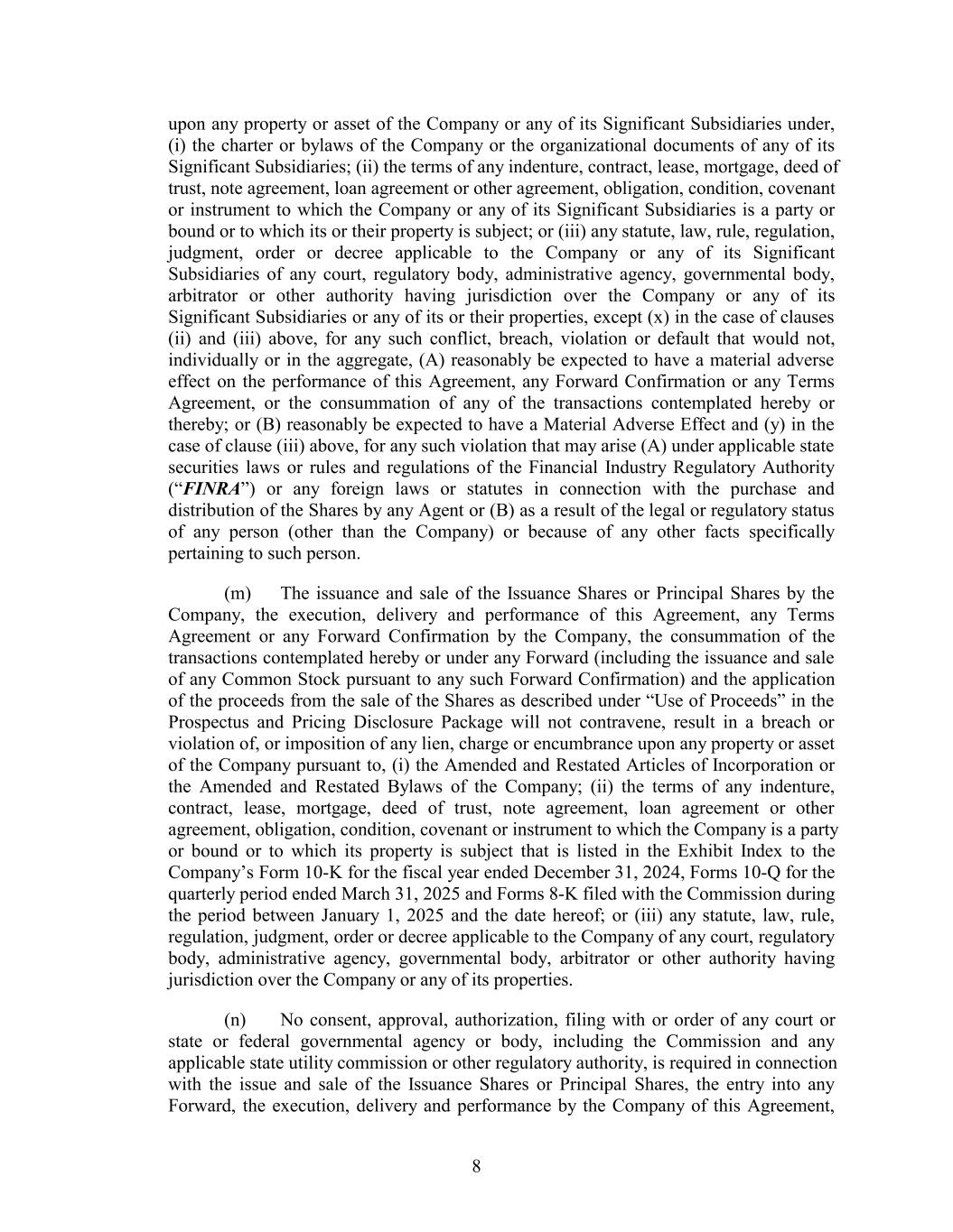 就公司或其任何重要附属公司的任何财产或资产而言,(i)公司章程或附例或其任何重要附属公司的组织文件;(ii)公司或其任何重要附属公司为一方或受其约束或其财产受其约束的任何契约、合约、租赁、抵押、信托契据、票据协议、贷款协议或其他协议、义务、条件、契诺或文书的条款;或(iii)任何法规、法律、规则、条例、判决,适用于公司或其任何重要附属公司的任何法院、监管机构、行政机构、政府机构、仲裁员或其他对公司或其任何重要附属公司或其任何财产具有管辖权的当局的命令或法令,但(x)在上述第(ii)和(iii)条的情况下,针对任何此类冲突、违约、违规或违约,而这些冲突、违约或违约不会单独或总体上(a)合理地预期会对本协议、任何远期确认或任何条款协议的履行产生重大不利影响,或在此或因此而拟进行的任何交易的完成;或(b)合理地预期会产生重大不利影响,及(y)在上述第(iii)条的情况下,针对(a)根据适用的州证券法律或金融业监管局(“FINRA”)的规则和条例或与任何代理人购买和分配股份有关的任何外国法律或法规或(b)由于任何人(公司除外)的法律或监管地位或由于与该人具体相关的任何其他事实而可能出现的任何此类违规行为。(m)公司发行及出售已发行股份或本金股份、本协议、任何条款协议或公司任何远期确认书的签立、交付及履行、本协议或任何远期确认书拟进行的交易的完成(包括根据任何该等远期确认书发行及出售任何普通股)以及招股章程及定价披露包中“所得款项用途”项下所述的出售股份所得款项的运用,均不会违反、导致违反或违反,或根据以下规定对公司的任何财产或资产施加任何留置权、押记或产权负担:(i)经修订和重述的公司章程或经修订和重述的公司章程;(ii)公司作为一方或受其约束的或其财产受其约束的任何契约、合同、租赁、抵押、信托契据、票据协议、贷款协议或其他协议、义务、条件、契诺或文书的条款,该等条款列于公司截至2024年12月31日止财政年度的10-K表格的附件索引中,截至2025年3月31日的季度期间的10-Q表格和2025年1月1日至本协议日期期间向委员会提交的8-K表格;或(iii)适用于公司的任何法院、监管机构、行政机构、政府机构、仲裁员或其他对公司或其任何财产具有管辖权的当局的任何法规、法律、规则、条例、判决、命令或法令。(n)在发行和出售发行股份或主要股份、订立任何远期协议、公司执行、交付和履行本协议方面,不需要任何法院或州或联邦政府机构或机构(包括委员会和任何适用的州公用事业委员会或其他监管机构)的同意、批准、授权、备案或命令,8