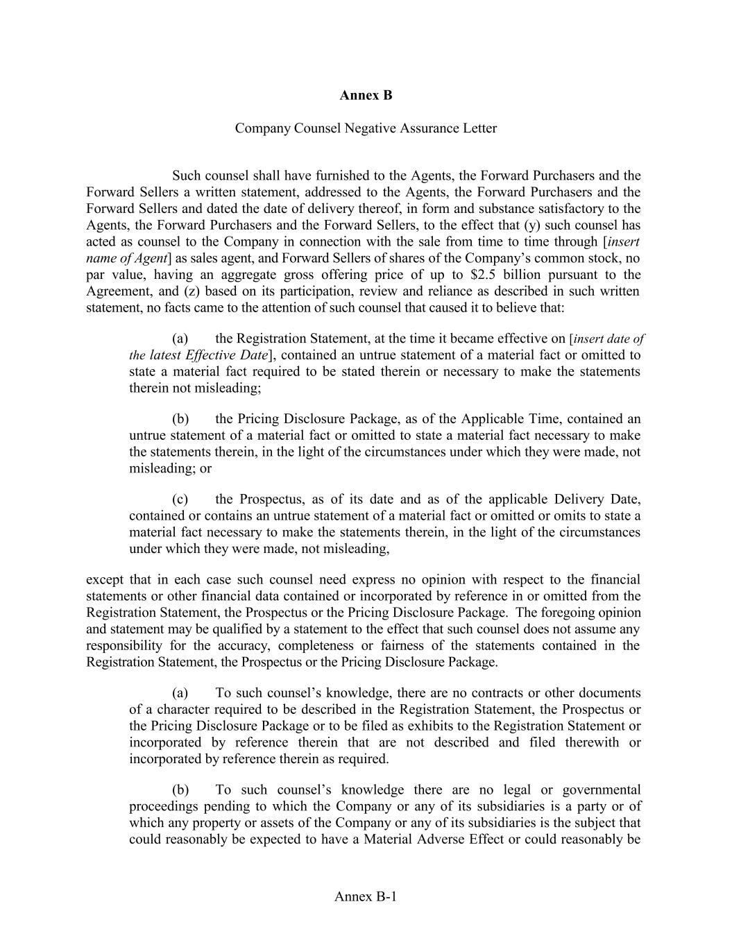 附件B公司法律顾问负面保证函该等法律顾问应已向代理、远期买方和远期卖方提供一份书面声明,内容为代理、远期买方和远期卖方满意的形式和实质内容,并注明交付日期,大意为(y)该法律顾问已通过[插入代理名称]作为销售代理不时担任公司与销售有关的法律顾问,以及公司普通股股份的远期卖方,没有面值,根据该协议的总发行价格高达25亿美元,并且(z)基于该书面声明中所述的参与、审查和依赖,该律师没有注意到任何事实,使其认为:(a)登记声明,在[插入最近生效日期的日期]生效时,包含对重大事实的不真实陈述,或未说明其中要求陈述或使其中的陈述不具误导性所必需的重大事实;(b)定价披露包在适用时间内包含对重大事实的不真实陈述,或未说明根据作出这些陈述的情况在其中作出陈述所必需的重大事实,而不具有误导性;或(c)招股说明书,截至其日期和截至适用的交付日期,包含或包含对重大事实的不真实陈述,或根据作出这些陈述的情况,遗漏或遗漏陈述在其中作出这些陈述所必需的重大事实,不具有误导性,但在每种情况下,该律师无需就注册声明、招股说明书或定价披露包中包含或以引用方式并入或遗漏的财务报表或其他财务数据发表意见。上述意见和陈述可通过声明加以限定,大意是该律师不对注册声明、招股说明书或定价披露包中所载陈述的准确性、完整性或公平性承担任何责任。(a)据该律师所知,没有任何合同或其他性质的文件需要在《注册说明书》、《招股说明书》或《定价披露包》中加以描述,或作为《注册说明书》的证据提交或以引用方式并入其中,而这些合同或文件并未与《说明书》一起加以描述和归档,或按要求以引用方式并入《说明书》。(b)据该大律师所知,公司或其任何附属公司为一方或公司或其任何附属公司的任何财产或资产为可合理地预期会产生重大不利影响或可合理地成为附件B-1的标的的法律或政府程序并无未决