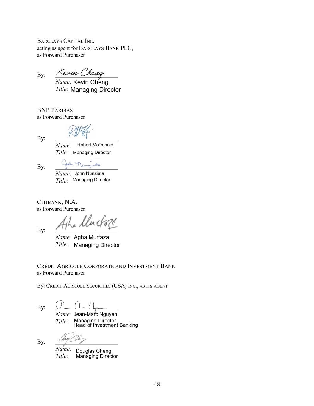 BARCLAYS CAPITAL INC.代理BARCLAYS BANK PLC,作为远期买方由:Name:Title:BNP PARIBAS作为远期买方由:Name:Title:Name:Title:CITIBANK,N.A.作为远期买方由:Name:Title:CR é dIT AGRICOLE CORPORATE and Investment Bank as Forward Purchaser by:CREDIT AGRICOLE SECURITIES(USA)INC.,作为其代理人由:Name:Title:Title:48 郑嘉颖董事总经理Agha Murtaza董事总经理Jean-Marc Nguyen董事总经理投资银行业务主管Douglas Cheng董事总经理Robert McDonald董事总经理John