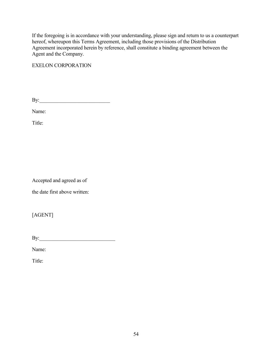 如前述内容与贵公司理解一致,请签署并交还给我们一份对应的协议,据此本条款协议,包括以引用方式并入本文的分销协议的那些条款,将构成代理与公司之间具有约束力的协议。EXELON CORPORATION By:______________________________ Name:Title:accepted and agreed as of the date first above written:[ Agent ] By:__________________________________ Name:Title:54