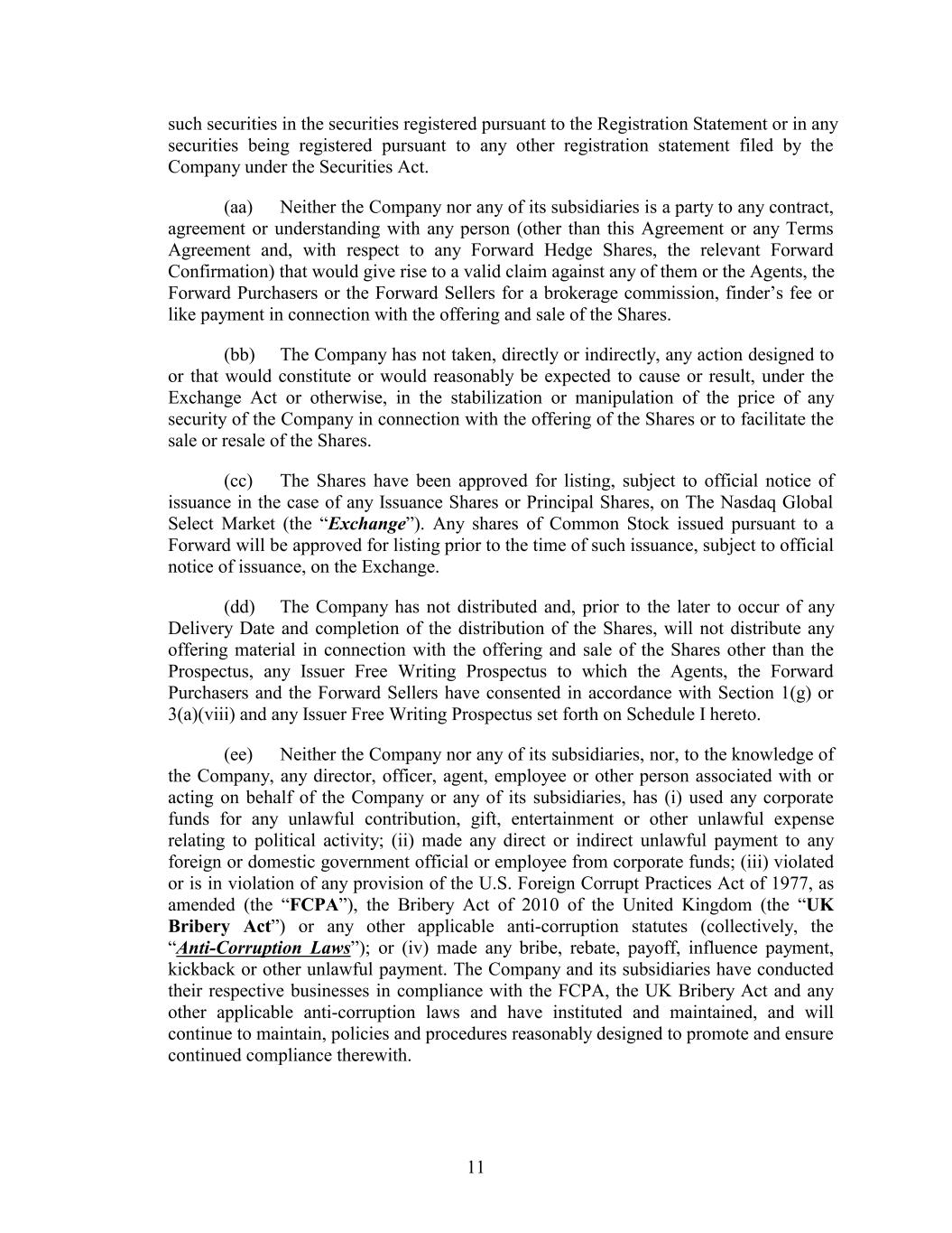 根据登记声明登记的证券中的此类证券或根据公司根据《证券法》提交的任何其他登记声明登记的任何证券中的此类证券。(aa)公司或其任何附属公司均不是与任何人订立的任何合同、协议或谅解(本协议或任何条款协议以及就任何远期对冲股份而言,相关远期确认除外)的一方,而该等合同、协议或谅解将导致就股份发售和出售而向他们中的任何人或代理、远期买方或远期卖方提出有效索赔,以获取经纪佣金、发现者费用或类似付款。(bb)公司没有直接或间接采取任何旨在或将构成或合理预期将根据《交易法》或其他方式导致或导致稳定或操纵公司与股份发售有关的任何证券的价格或促进股份出售或转售的行动。(CC)股份已获批准于纳斯达克全球精选市场(“联交所”)上市,惟须待就任何已发行股份或本金股份发出正式发行通知后,方可作实。根据远期协议发行的任何普通股股份将获准在此类发行时间之前在交易所上市,但以正式发行通知为准。(dd)公司并无分派,且在任何交付日期及股份分派完成的较后日期发生前,除招股章程、代理、远期买方及远期卖方已根据第1(g)或3(a)(viii)条同意的任何发行人自由书面招股章程及附表I所载的任何发行人自由书面招股章程外,公司将不会分派与股份发售及销售有关的任何发售材料。(ee)公司或其任何附属公司,或据公司所知,任何董事、高级人员、代理人、雇员或与公司或其任何附属公司有关联或代表公司行事的其他人,均未(i)将任何公司资金用于任何与政治活动有关的非法捐款、馈赠、娱乐或其他非法开支;(ii)从公司资金中向任何外国或国内政府官员或雇员进行任何直接或间接的非法付款;(iii)违反或违反1977年美国《反海外腐败法》的任何规定,经修订(《反海外腐败法》)、英国《2010年反贿赂法》(《英国反贿赂法》)或任何其他适用的反腐败法规(统称《反腐败法》);或(四)作出任何贿赂、回扣、偿付、影响付款、回扣或其他非法付款。公司及其附属公司已根据《反海外腐败法》、《英国反贿赂法》和任何其他适用的反腐败法律开展各自的业务,并已制定和维持并将继续维持合理设计的政策和程序,以促进和确保继续遵守这些法律和程序。11