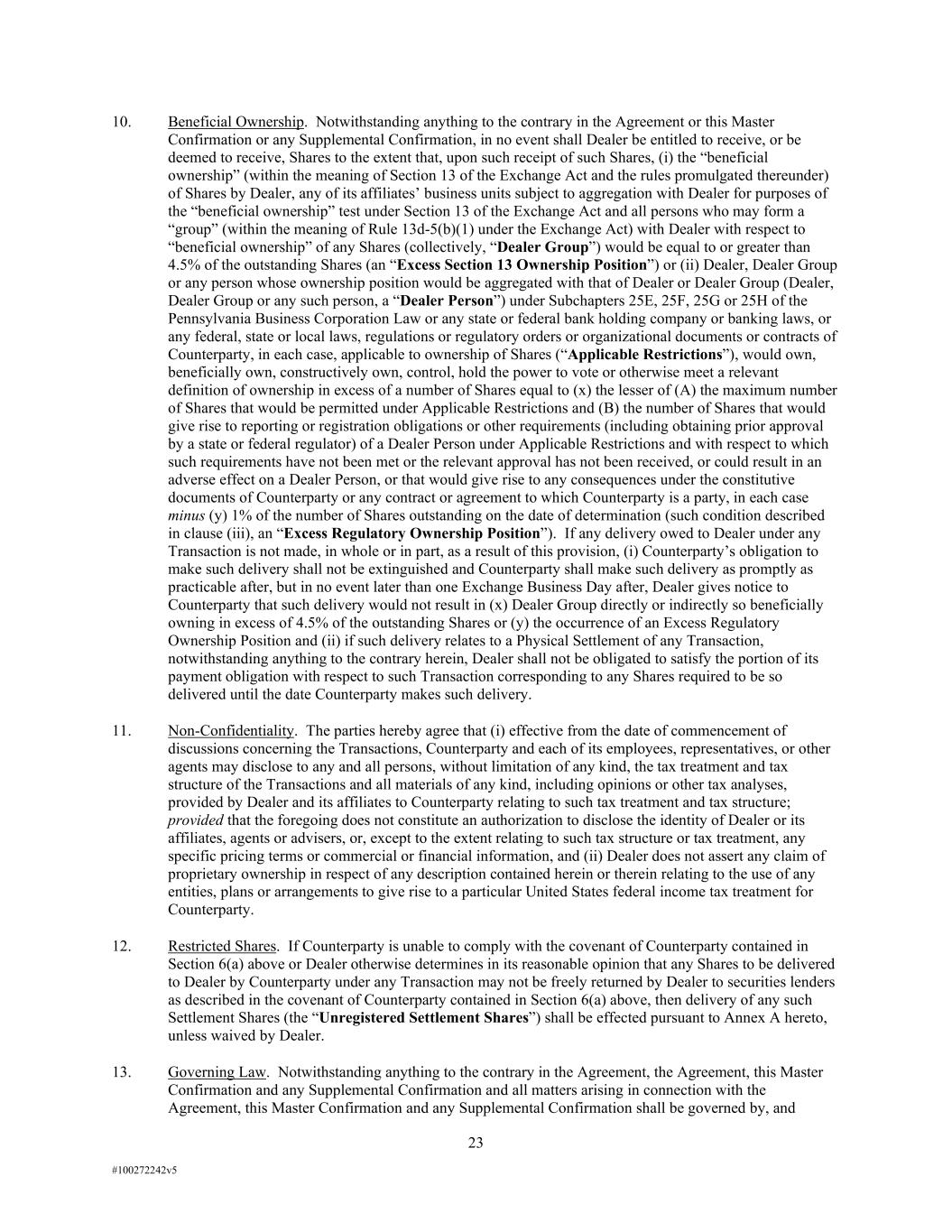 23 # 100272242v5 10。实益所有权。尽管协议或本主确认书或任何补充确认书中有任何相反的规定,在任何情况下,交易商均无权获得或被视为获得股份,只要在收到此类股份时,(i)交易商对股份的“实益所有权”(在《交易法》第13条及其下颁布的规则的含义内),为《交易法》第13条规定的“实益所有权”测试的目的,其任何关联公司的业务单位须与交易商合并,以及所有可能与交易商就任何股份的“实益所有权”(统称为“交易商集团”)组成“集团”(根据《交易法》第13d-5(b)(1)条的含义)的人,将等于或高于已发行股份的4.5%(“超额第13条所有权地位”)或(ii)交易商、交易商集团或其所有权地位将与交易商或交易商集团的所有权地位合并的任何人(交易商,Dealer Group或任何此类人士,“交易商人士”)根据《宾夕法尼亚州商业公司法》第25E、25F、25G或25H子章或任何州或联邦银行控股公司或银行法,或任何联邦、州或地方法律、法规或监管命令或交易对手的组织文件或合同,在每种情况下,适用于股份所有权(“适用限制”),将拥有、实益拥有、建设性拥有、控制,持有投票权或以其他方式满足所有权相关定义的股份数量超过等于(x)(a)适用限制下允许的最大股份数量和(b)根据适用限制将导致交易商的报告或登记义务或其他要求(包括获得州或联邦监管机构的事先批准)且此类要求未得到满足或未收到相关批准的股份数量中的较低者,或可能对交易商造成不利影响,或会导致根据交易对手的构成文件或交易对手为一方的任何合同或协议产生的任何后果,在每种情况下减去(y)确定之日已发行股份数量的1%(第(iii)条所述的条件,“超额监管所有权地位”)。如任何交易项下所欠交易商的任何交割未因本条文而全部或部分作出,(i)交易对手作出该等交割的义务不应消灭,且交易对手应于其后在切实可行范围内尽快作出该等交割,但在任何情况下均不得迟于其后的一个交易所营业日,交易商向交易对手发出通知,此类交付不会导致(x)交易商集团直接或间接如此实益地拥有超过4.5%的已发行股份或(y)出现超额监管所有权头寸,以及(ii)如果此类交付涉及任何交易的实物结算,尽管本文有任何相反规定,交易商在交易对手进行此类交付之日之前没有义务履行其就该交易所承担的与所需如此交付的任何股份相对应的付款义务部分。11.非保密。各方特此同意,(i)自有关交易的讨论开始之日起生效,交易对手及其每一名雇员、代表或其他代理人可向任何及所有人(不限于任何种类)披露交易的税务处理和税务结构以及交易商及其关联公司向交易对手提供的与此类税务处理和税务结构有关的所有任何种类的资料,包括意见或其他税务分析;但上述情况不构成披露交易商或其关联公司、代理人或顾问身份的授权,或,除与此种税务结构或税务处理、任何具体定价条款或商业或财务信息有关的范围外,以及(ii)交易商不就本文或其中所载的与使用任何实体、计划或安排为交易对手产生特定美国联邦所得税处理有关的任何描述主张任何所有权主张。12.限制性股票。如果交易对手无法遵守上文第6(a)节所载的交易对手契诺,或交易商在其合理意见中另有决定,交易对手在任何交易下将交付给交易商的任何股份不得由交易商按上文第6(a)节所载的交易对手契诺所述自由返还给证券出借人,则任何该等结算股份(“未登记结算股份”)的交付应根据本协议附件A进行, 除非被经销商放弃。13.管辖法律。尽管本协议、本协议、本主确认书及任何补充确认书有任何相反的规定,以及与本协议有关的所有事项,本主确认书及任何补充确认书均应受其管辖,及