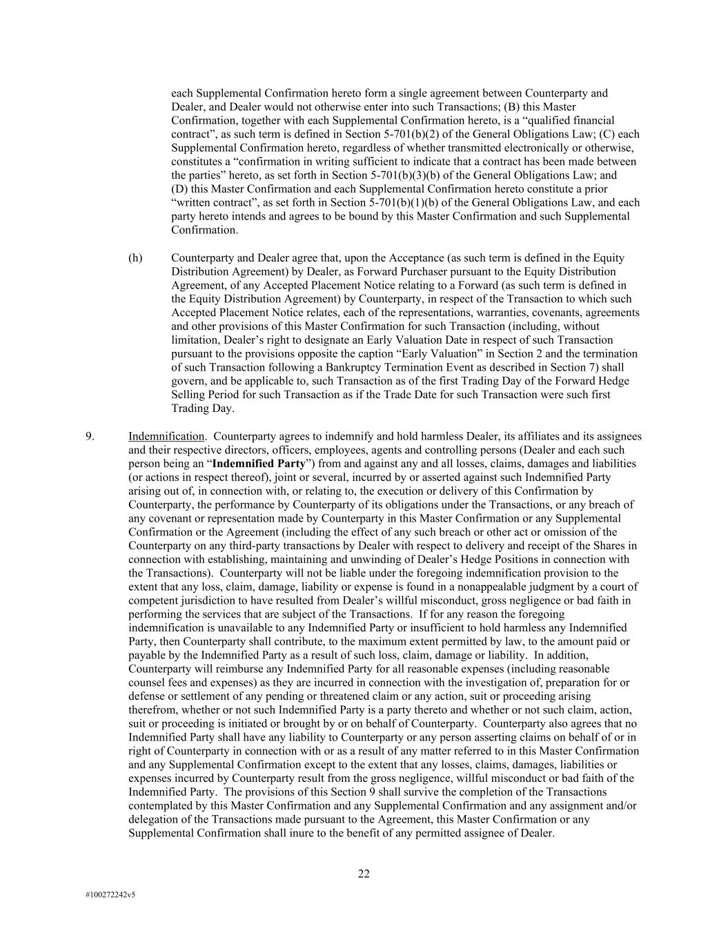 22 # 100272242v5本协议的每一份补充确认书在交易对方和交易商之间形成单一协议,交易商不会以其他方式进行此类交易;(b)本主确认书连同本协议的每一份补充确认书是“合格的金融合同”,该术语在《一般义务法》第5-701(b)(2)节中定义;(c)本协议的每一份补充确认书,无论是否以电子方式传送,均构成本协议的“足以表明双方已订立合同的书面确认书”,根据《一般义务法》第5-701(b)(3)(b)节的规定;和(d)本主确认书和本合同的每一份补充确认书构成《一般义务法》第5-701(b)(1)(b)节规定的事先“书面合同”,本合同的每一方均打算并同意受本主确认书和该补充确认书的约束。(h)交易对方和交易商同意,在交易商作为根据Equity Distribution协议的远期买方接受(该等术语在TERM1协议中定义)任何已接受的与交易对方就该已接受的配售通知所关乎的交易有关的远期(该等术语在Equity Distribution协议中定义)的配售通知时,就该已接受的配售通知而言,就该等交易作出的每项陈述、保证、契诺、协议及本主确认书的其他规定(包括但不限于,交易商根据第2节“提前估值”标题相对的规定指定此类交易的提前估值日期的权利,以及在第7节)中所述的破产终止事件后终止此类交易的权利,应管辖并适用于此类交易的远期对冲卖出期的第一个交易日的此类交易,如同此类交易的交易日期是此类第一个交易日一样。9.赔偿。交易对方同意就因交易对方执行或交付本确认书、交易对方履行其在交易项下的义务而引起、与之相关或与之相关的任何和所有损失、索赔、损害和责任(或与之相关的行动),对交易商、其关联公司及其受让人及其各自的董事、高级管理人员、雇员、代理人和控制人(交易商和每一此类人为“受偿方”)进行赔偿并使其免受损害,或任何违反交易对手在本主确认书或任何补充确认书或协议中作出的任何契诺或陈述(包括交易对手的任何该等违反或其他作为或不作为对交易商就与交易有关的交易商对冲头寸的建立、维持和解除有关的股份交付和接收的任何第三方交易的影响)。如果有管辖权的法院在不可上诉的判决中发现任何损失、索赔、损害、责任或费用是由于交易商在履行交易标的服务时的故意不当行为、重大过失或恶意导致的,则交易对手方不会根据上述赔偿条款承担责任。如果由于任何原因,任何被赔偿方无法获得上述赔偿或不足以使任何被赔偿方免受损害,则交易对方应在法律允许的最大范围内,对被赔偿方因此类损失、索赔、损害或责任而支付或应付的金额作出贡献。此外,交易对手将向任何受弥偿方偿还因调查、准备或抗辩或解决任何未决或威胁索赔或由此产生的任何诉讼、诉讼或程序而产生的所有合理费用(包括合理的律师费和开支),无论该受弥偿方是否为其一方,也无论该索赔、诉讼、诉讼或程序是否由交易对手或代表对方发起或提起。交易对方亦同意,任何获弥偿方均不得就本主确认书及任何补充确认书所提述的任何事项或因该事项而对交易对方或代表交易对方主张债权或对其权利主张债权的任何人承担任何责任,除非交易对方因重大过失而招致的任何损失、债权、损害、责任或费用, 被赔方的故意不当行为或恶意。本条第9款的规定应在本主确认书所设想的交易完成后继续有效,且任何补充确认书以及依据本协议作出的交易的任何转让和/或转授、本主确认书或任何补充确认书均应符合交易商的任何许可受让人的利益。