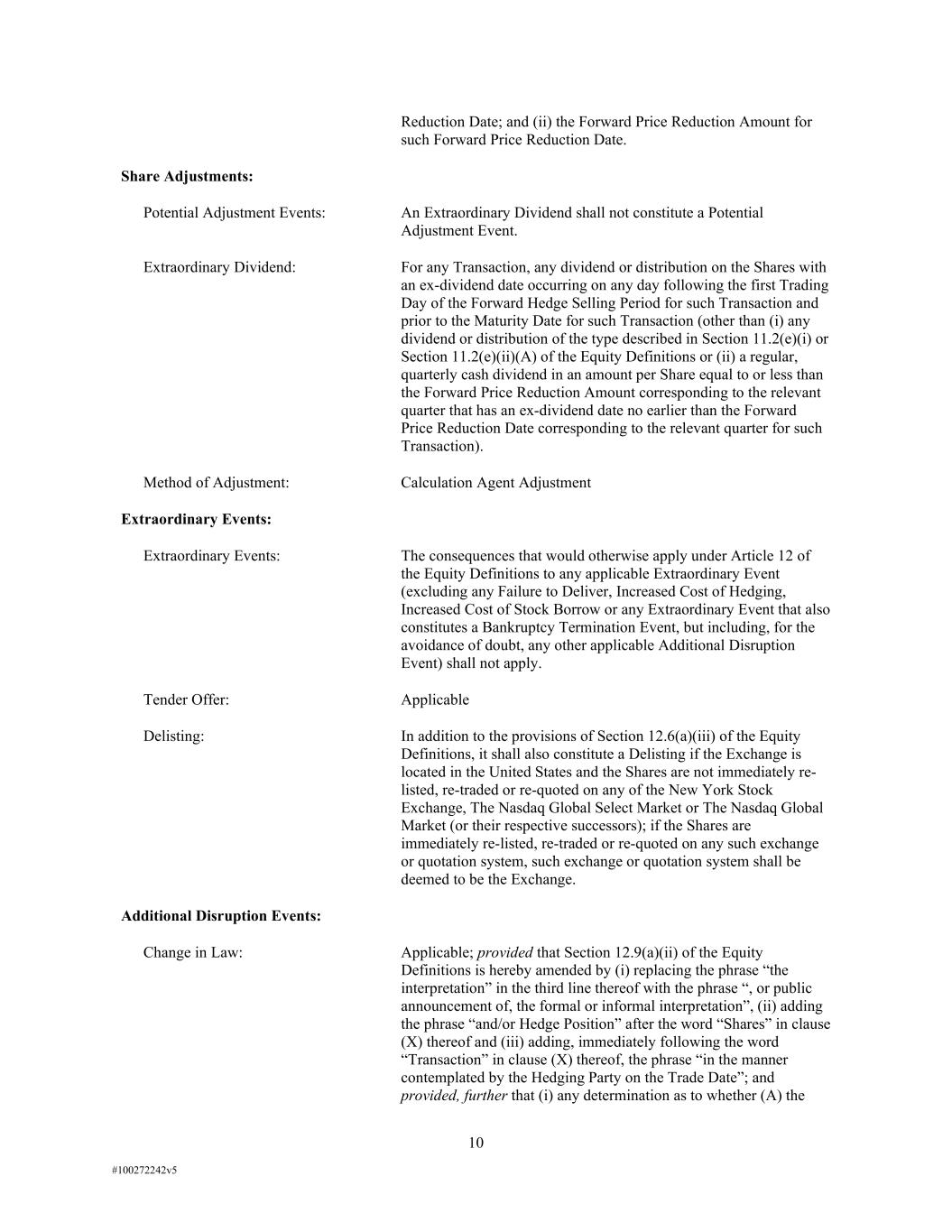10 # 100272242v5减持日期;及(ii)该等远期减持日的远期减持价金额。股份调整:潜在调整事件:特别股息不构成潜在调整事件。特别股息:就任何交易而言,除息日发生在该交易的远期对冲卖出期的第一个交易日之后和该交易到期日前的任何一天的股份的任何股息或分派(不包括(i)股权定义第11.2(e)(i)节或第11.2(e)(ii)(a)节所述类型的任何股息或分派或(ii)定期,季度现金股息,每股金额等于或小于有除息日的相关季度对应的远期减价金额不早于该交易的相关季度对应的远期减价日期)。调整方法:计算代理调整非常事件:非常事件:根据股权定义第12条本应适用于任何适用的非常事件(不包括任何未能交付、套期保值成本增加、股票借贷成本增加或任何同样构成破产终止事件的非常事件,但为免生疑问,包括任何其他适用的额外中断事件)的后果不适用。要约收购:适用退市:除股票定义第12.6(a)(iii)节的规定外,如果交易所位于美国,且股票没有立即在纽约证券交易所、纳斯达克全球精选市场或纳斯达克全球市场(或其各自的继任者)中的任何一个重新上市、重新交易或重新报价,则也应构成退市;如果股票立即在任何该等交易所或报价系统重新上市、重新交易或重新报价,则该交易所或报价系统应被视为该交易所。额外干扰事件:法律变更:适用;但特此修订权益定义第12.9(a)(ii)节,方法是:(i)将其第三行中的“解释”一语替换为“或正式或非正式解释的公开公告”,(ii)在其(X)条中的“股份”一词之后添加“和/或对冲头寸”,以及(iii)在紧接其(X)条中的“交易”一词之后添加“以对冲方在交易日期所设想的方式”;并进一步规定,(i)任何确定是否(a)