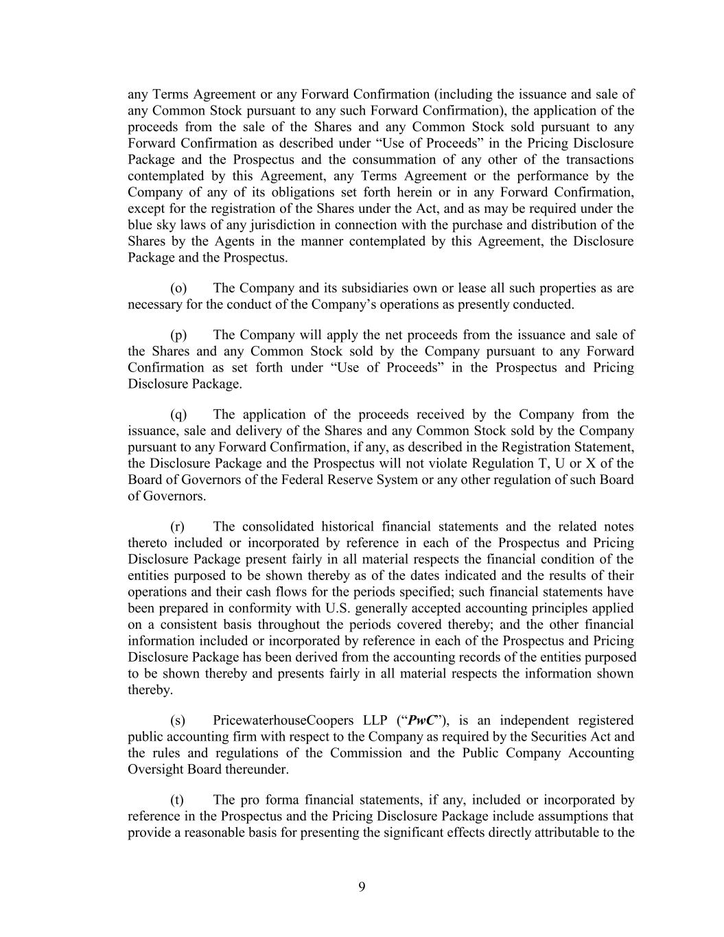任何条款协议或任何远期确认书(包括根据任何此类远期确认书发行和出售任何普通股)、根据定价披露包和招股说明书中“所得款项用途”项下所述的任何远期确认书出售股份和任何普通股的收益的应用以及本协议、任何条款协议或公司履行本协议或任何远期确认书中规定的任何义务所设想的任何其他交易的完成,除根据该法案登记股份外,以及根据任何司法管辖区的蓝天法律可能要求的与代理以本协议、披露包和招股说明书所设想的方式购买和分配股份有关的情况。(o)公司及其附属公司拥有或租赁为进行目前进行的公司业务所需的所有该等物业。(p)公司将根据招股章程和定价披露包中“所得款项用途”项下所述的任何远期确认,运用发行和出售股份及公司根据任何远期确认出售的任何普通股的所得款项净额。(q)申请公司根据注册声明、披露包和招股说明书中所述的任何远期确认(如有)发行、出售和交付股份和公司出售的任何普通股所收到的收益,不会违反联邦储备系统理事会的T、U或X条例或该理事会的任何其他条例。(r)每一份《招股说明书》和定价披露资料包中包括或以引用方式并入的合并历史财务报表及其相关附注,在所有重大方面公允列报了拟由其显示的实体截至所示日期的财务状况以及其在所述期间的经营业绩和现金流量;此类财务报表是按照在所涵盖期间一致适用的美国公认会计原则编制的;招股说明书和定价披露包中的每一项中包含或以引用方式并入的其他财务信息均来自旨在由此显示的实体的会计记录,并在所有重大方面公平地反映了由此显示的信息。(s)PricewaterhouseCoopers LLP(“普华永道”)是一家独立的注册公共会计师事务所,根据《证券法》以及委员会和上市公司会计监督委员会的规则和条例的要求,就公司而言。(t)《招股章程》和《定价披露一揽子计划》中包括或以引用方式纳入的备考财务报表(如有)包括的假设为列报直接归因于上述9项的重大影响提供了合理基础