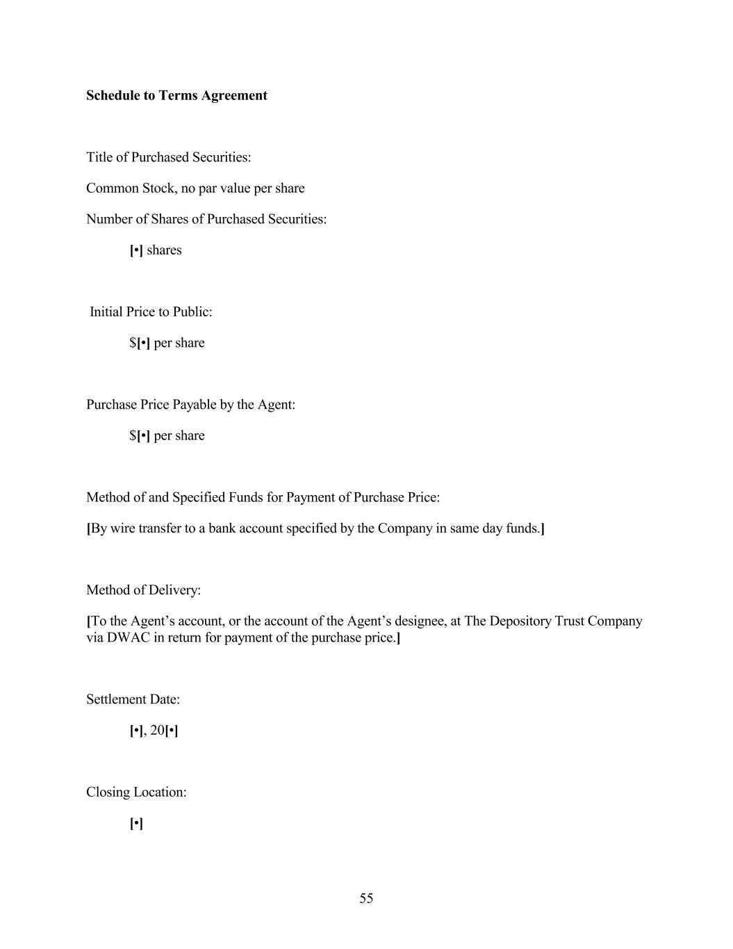 所购证券的条款协议附表购买证券的名称:普通股,无每股面值购买证券的股份数量:[ • ]股份首次公开发行价格:$ [ • ]每股购买价格代理人应付的购买价格:$ [ • ]每股支付购买价款的方式和指定资金:[电汇至公司当日指定的银行账户的资金。]交割方式:[至代理人账户,或代理人指定人的账户,在存管信托公司通过DWAC支付购买价款。]结算日:[ • ],20 [ • ]收盘地点:[ • ] 55