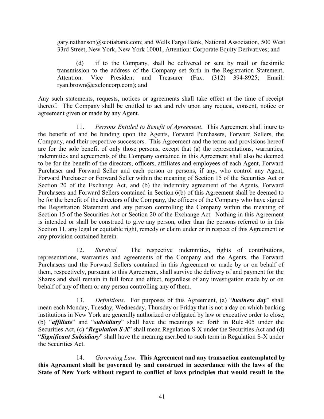 gary.nathanson@scotiabank.com;及富国银行银行,National Association,500 West 33rd Street,New York,New York 10001,注意:公司股票衍生品;及(d)如向公司送达或以邮件或传真方式传送至注册声明所载公司地址,注意:副总裁兼财务主管(传真:(312)394-8925;电子邮件:ryan.brown@exeloncorp.com);任何该等声明、请求、通知或协议应在收到时生效。公司有权采取行动并依赖任何代理人提出或作出的任何请求、同意、通知或协议。11.有权享有协议利益的人。本协议对代理人、远期买方、远期卖方、公司及其各自的继承人均有利,并具有约束力。本协议及本协议的条款和规定仅为这些人的唯一利益,但(a)本协议所载的公司的陈述、保证、赔偿和协议也应被视为为每个代理、远期买方和远期卖方的董事、高级职员、关联公司和雇员以及控制《证券法》第15条或《交易法》第20条所指的任何代理、远期买方或远期卖方的每个人或个人(如有)的利益,以及(b)代理的赔偿协议,本协议第6(b)节所载的远期买方和远期卖方应被视为为公司董事、签署登记声明的公司高级管理人员以及《证券法》第15条或《交易法》第20条所指的任何控制公司的人的利益。本协议的任何内容均无意或不应被解释为根据本协议或本协议所载的任何条款或就本协议或本协议所载的任何条款给予除本第11条所指的人以外的任何人任何法律或衡平法上的权利、补救或要求。12.生存。本协议所载或分别由他们或代表他们根据本协议作出的本公司与代理、远期买方和远期卖方各自的赔偿、分担权、陈述、保证和协议,在股份交付和付款后仍有效,并应保持完全有效,无论由他们中的任何人或控制他们中的任何人或代表他们中的任何人进行的任何调查或代表他们进行的任何调查。13.定义。就本协议而言,(a)“营业日”系指并非法律或行政命令一般授权或有义务关闭纽约的银行机构的每个星期一、星期二、星期三、星期四或星期五,(b)“关联公司”和“子公司”应具有《证券法》第405条规定的含义,(c)“S-X条例”系指《证券法》下的S-X条例,(d)“重要子公司”应具有《证券法》下的S-X条例中该术语所赋予的含义。14.管辖法律。本协议和本协议所设想的任何交易应受纽约州法律管辖并按其解释,而不考虑将导致41