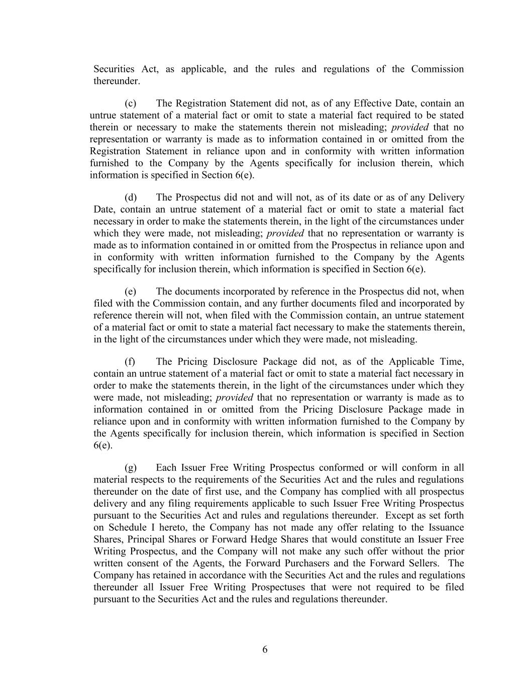 《证券法》(如适用)以及委员会根据其制定的规则和条例。(c)于任何生效日期,注册声明并无载有对重要事实的不真实陈述,或没有述明其中须述明或为使其中的陈述不具误导性所必需的重要事实;但并无就注册声明中所载或遗漏的资料作出任何陈述或保证,而该等资料是依赖并符合各代理人向公司提供的专为载入其中的书面资料,而该等资料已在第6(e)条中指明。(d)招股章程截至其日期或任何交付日期,并无亦不会载有对重大事实的不真实陈述,或根据作出该等陈述的情况,略去陈述作出该等陈述所必需的重大事实,而不具误导性;但并无就招股章程所载或遗漏的资料作出任何陈述或保证,而该等资料是依赖并符合各代理人向公司提供的专门列入该等资料的书面资料,而该等资料已在第6(e)条中指明。(e)招股章程中以引用方式并入的文件在向监察委员会提交时并未包含,且任何进一步提交并以引用方式并入其中的文件在向监察委员会提交时将不会包含对重大事实的不真实陈述或根据作出这些陈述的情况而未说明在其中作出这些陈述所必需的重大事实,而不是误导。(f)定价披露包在适用的时间内没有包含对重大事实的不真实陈述,或根据作出这些陈述的情况,没有遗漏陈述作出其中陈述所必需的重大事实,而不是误导;但对于定价披露包中所包含或遗漏的信息,不作任何陈述或保证,这些信息是依据并符合代理人专门为列入其中而向公司提供的书面信息而作出的,这些信息在第6(e)节中有具体规定。(g)各发行人自由编写招股说明书在首次使用之日符合或将在所有重大方面符合《证券法》及其项下规则和条例的要求,公司已根据《证券法》及其项下规则和条例遵守适用于该发行人自由编写招股说明书的所有招股说明书交付和任何备案要求。除本协议附表I所列情况外,公司并无就发行股份、本金股份或远期对冲股份提出任何将构成发行人自由撰写招股章程的要约,且未经代理、远期买方及远期卖方事先书面同意,公司将不会提出任何该等要约。公司已根据《证券法》及其下的规则和条例保留了根据《证券法》及其下的规则和条例无需提交的所有发行人自由书面招股说明书。6