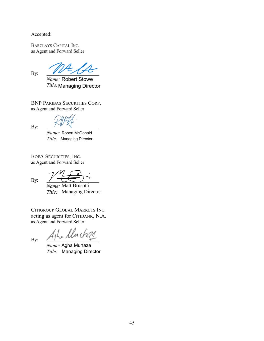 接受:BARCLAYS CAPITAL INC.作为代理和远期卖方作者:Name:Title:BNP PARIBAS SECURITIES CORP.作为代理和远期卖方作者:Name:Title:BOFA SECURITIES,INC.作为代理和远期卖方作者:Name:Title:CITIGROUP Global MarketS INC.代理CITIBANK,N.A.作为代理和远期卖方作者:Name:Title:45 Robert Stowe董事总经理Matt Brusotti董事总经理Agha Murtaza董事总经理Robert McDonald董事总经理