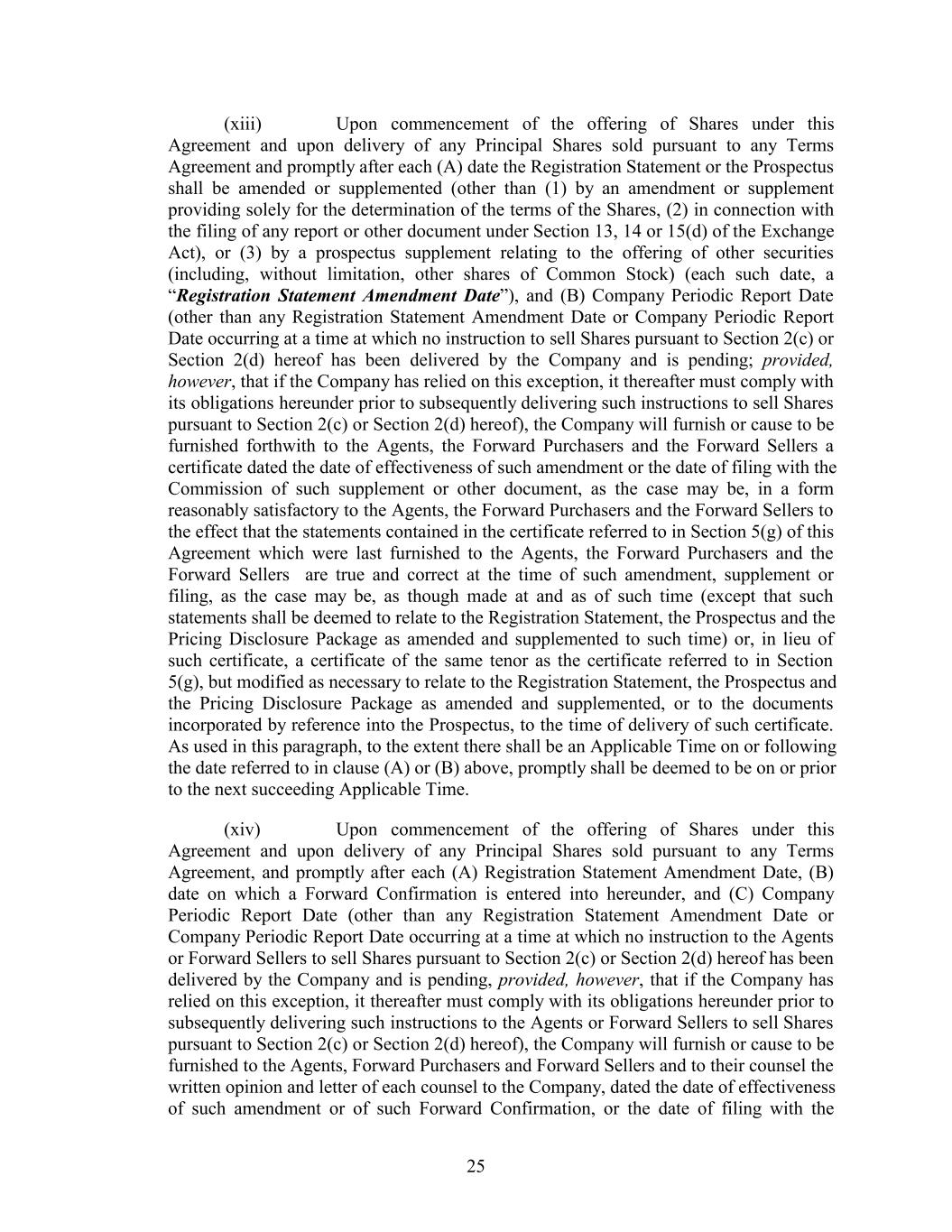 (xiii)在根据本协议开始发售股份时,以及在交付根据任何条款协议出售的任何主要股份时,并在每个(a)日期后迅速修订或补充登记声明或招股章程(除(1)外,须通过仅规定确定股份条款的修订或补充,(2)与根据《交易法》第13、14或15(d)条提交任何报告或其他文件有关),或(3)通过与发售其他证券有关的招股章程补充(包括但不限于,普通股的其他股份)(每个该等日期,一个“登记声明修订日期”),以及(b)公司定期报告日期(任何登记声明修订日期或公司定期报告日期除外,该日期发生在公司未交付任何根据本条例第2(c)或第2(d)条出售股份的指示且正在等待处理的时间;但条件是,如果公司依赖这一例外情况,则此后必须遵守其在本条例下的义务,然后再根据本条例第2(c)或第2(d)条交付此类出售股份的指示,公司将立即向代理、远期买方及远期卖方提供或安排向其提供一份日期为该修订生效日期或该补充文件或其他文件(视属何情况而定)向监察委员会提交日期的证明书,其格式令代理、远期买方及远期卖方合理满意,大意为本协议第5(g)节所提述的证明书所载最后一次向代理提供的报表,远期买方及远期卖方在作出该等修订、补充或备案(视属何情况而定)时,均属真实及正确,犹如是在该时间及截至该时间作出的(但该等陈述须当作与经修订及补充的注册说明书、招股章程及定价披露资料包有关),或代替该等证书的是与第5(g)节所提述的证书具有相同期限的证书,但须作必要的修订以与注册说明书有关,经修订和补充的招股章程和定价披露包,或以引用方式并入招股章程的文件,直至该证书的交付时间。如本款所用,在上文(a)或(b)款所述日期当日或之后有适用时间的范围内,应迅速视为在下一个适用时间当日或之前。(xiv)在根据本协议开始发售股份时及在交付根据任何条款协议出售的任何主要股份时,以及在每个(a)登记声明修订日期、(b)根据本协议订立远期确认的日期及(c)公司定期报告日期(任何登记声明修订日期或公司定期报告日期除外,该日期发生于公司未交付根据本协议第2(c)或第2(d)条向代理或远期卖方出售股份的指示且有待执行,但,如果公司依赖这一例外情况,此后必须遵守其在本协议项下的义务,然后才能根据本协议第2(c)节或第2(d)节向代理或远期卖方交付此类指示以出售股份),公司将向代理、远期买方和远期卖方及其律师提供或促使向其律师提供每名律师向公司提供的书面意见和信函,日期为该修订或该远期确认的生效日期,或向25