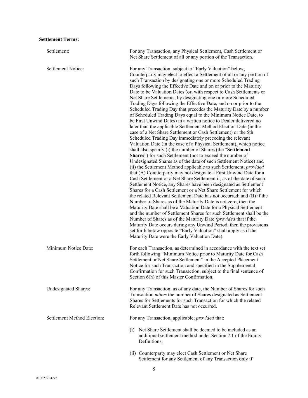 5 # 100272242v5结算条款:结算:对任何一笔交易,进行全部或任何部分交易的任何实物结算、现金结算或净份额结算。结算通知:对于任何交易,受以下“提前估值”的约束,交易对手方可选择通过指定生效日期之后的一个或多个预定交易日和到期日或之前为估值日(或,就现金结算或股份净结算而言,通过指定生效日期之后的一个或多个预定交易日,以及在到期日之前的预定交易日或之前的几个预定交易日等于最短通知日期,来实现该交易的全部或任何部分的结算,为首次平仓日期)在不迟于适用的结算方式选择日期(如为净股份结算或现金结算)或紧接相关估值日期前的第5个预定交易日(如为实物结算)向交易商送达的书面通知中,该通知还应具体说明(i)该等交收的股份数量(“交收股份”)(不超过截至该交收通知之日的未指定股份数量)和(ii)适用于该等交收的交收方式;但(a)交易对方不得指定现金交收或净股份交收的第一个解盘日,如果截至该交收通知之日,任何股份已被指定为现金结算或净股份结算的结算股份,而有关的相关结算日并未发生;及(b)如截至到期日的股份数目并非为零,则该到期日应为实物结算的估值日期,而该等结算的结算股份数目应为截至到期日的股份数目(但如该到期日发生在任何解盘期内,则适用下文“提前估值”对面的规定,如同到期日为提前估值日一样)。最低通知日期:就每宗交易而言,根据有关该交易的已接纳配售通知中下列“现金结算或净股份结算到期日前的最低通知”的文字确定并在有关该交易的补充确认书中指明,但以本主确认书第6(h)节的最后一句为准。未指定股份:就任何交易而言,截至任何日期,有关交易的股份数目减指定为有关相关结算日尚未发生的该等交易的结算股份的数目。结算方式选择:对于任何交易,均适用;但前提是:(i)净份额结算应被视为纳入权益定义第7.1节下的额外结算方式;(ii)交易对手方可以选择现金结算或净份额结算,以进行任何交易的任何结算,只有在
