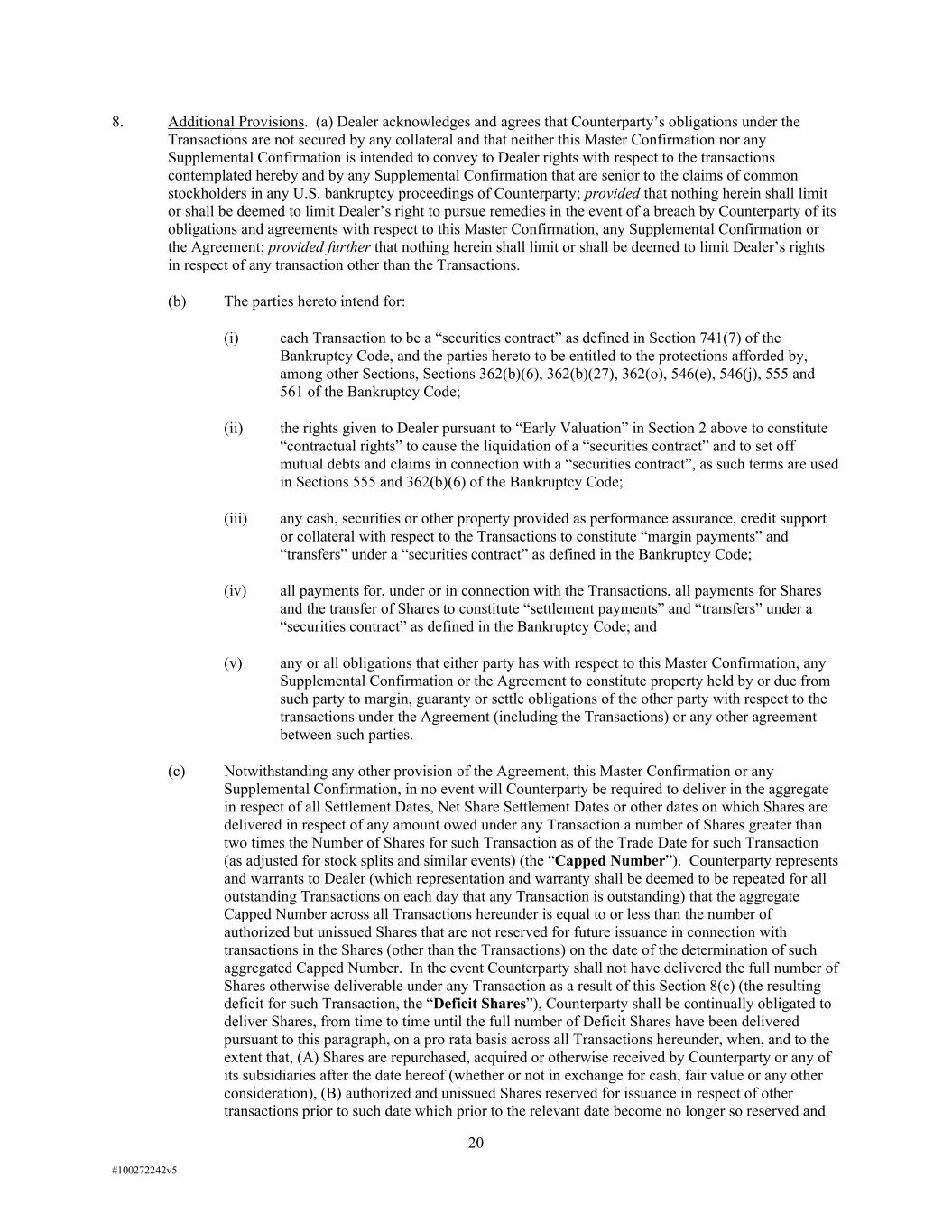 20 # 100272242v5 8。附加条款。(a)交易商承认并同意,交易对手在交易项下的义务没有任何抵押品作担保,并且本主确认书或任何补充确认书均无意向交易商转让与本协议所设想的交易有关的权利,以及通过在交易对手的任何美国破产程序中优先于普通股股东债权的任何补充确认书;但本协议中的任何内容均不得限制或应被视为限制交易商在交易对手违反其与本主确认书有关的义务和协议的情况下寻求补救的权利,任何补充确认或协议;进一步规定,本协议中的任何内容均不得限制或应被视为限制交易商在交易以外的任何交易方面的权利。(b)协议各方打算:(i)每项交易均为《破产法》第741(7)条所定义的“证券合同”,协议各方有权获得《破产法》第362(b)(6)、362(b)(27)、362(o)、546(e)、546(j)、555和561条等条款所提供的保护;(ii)根据上文第2节中的“提前估值”赋予交易商的权利,构成导致“证券合同”清算和与“证券合同”相关的相互债务和债权的“合同权利”,由于《破产法》第555条和第362(b)(6)条使用了这些术语;(iii)就交易提供的作为履约保证、信用支持或抵押品的任何现金、证券或其他财产构成《破产法》所定义的“证券合同”下的“保证金支付”和“转让”;(iv)就交易、根据交易或与交易有关的所有支付,根据《破产法》定义的“证券合同”,所有股份付款和股份转让构成“结算付款”和“转让”;(v)任何一方就本主确认书、任何补充确认书或协议承担的任何或所有义务,构成另一方就协议(包括交易)或该等方之间的任何其他协议下的交易而持有或应从该等方承担的保证金、担保或结算义务的财产。(c)尽管有协议、本主确认书或任何补充确认书的任何其他规定,在任何情况下,交易对手均无须就所有结算日、净股份结算日或就任何交易项下所欠的任何款项交付股份的其他日期合计交付多于截至该交易的交易日期(根据股票分割和类似事件调整)该交易的股份数量两倍的股份数量(“上限数量”)。交易对手向交易商声明并保证(在任何未完成交易的每一天,该陈述和保证应被视为对所有未完成交易重复)本协议项下所有交易的合计上限数量等于或少于在确定该合计上限数量之日不为未来发行的与股份交易(交易除外)有关的已获授权但未发行的股份数量。如因本条第8款(c)项而导致交易对手方未交付任何交易项下以其他方式可交付的全部股份(由此产生的此类交易的赤字,即“赤字股份”),则交易对手方应持续有义务在本协议项下的所有交易中按比例交付股份,不时直至根据本款交付全部赤字股份为止,当且在(a)股份被回购的范围内,由交易对手或其任何附属公司于本协议日期后取得或以其他方式收取(不论是否以现金、公允价值或任何其他代价作为交换),(b)就有关日期前已不再如此保留的其他交易而为发行而预留的授权及未发行股份及
