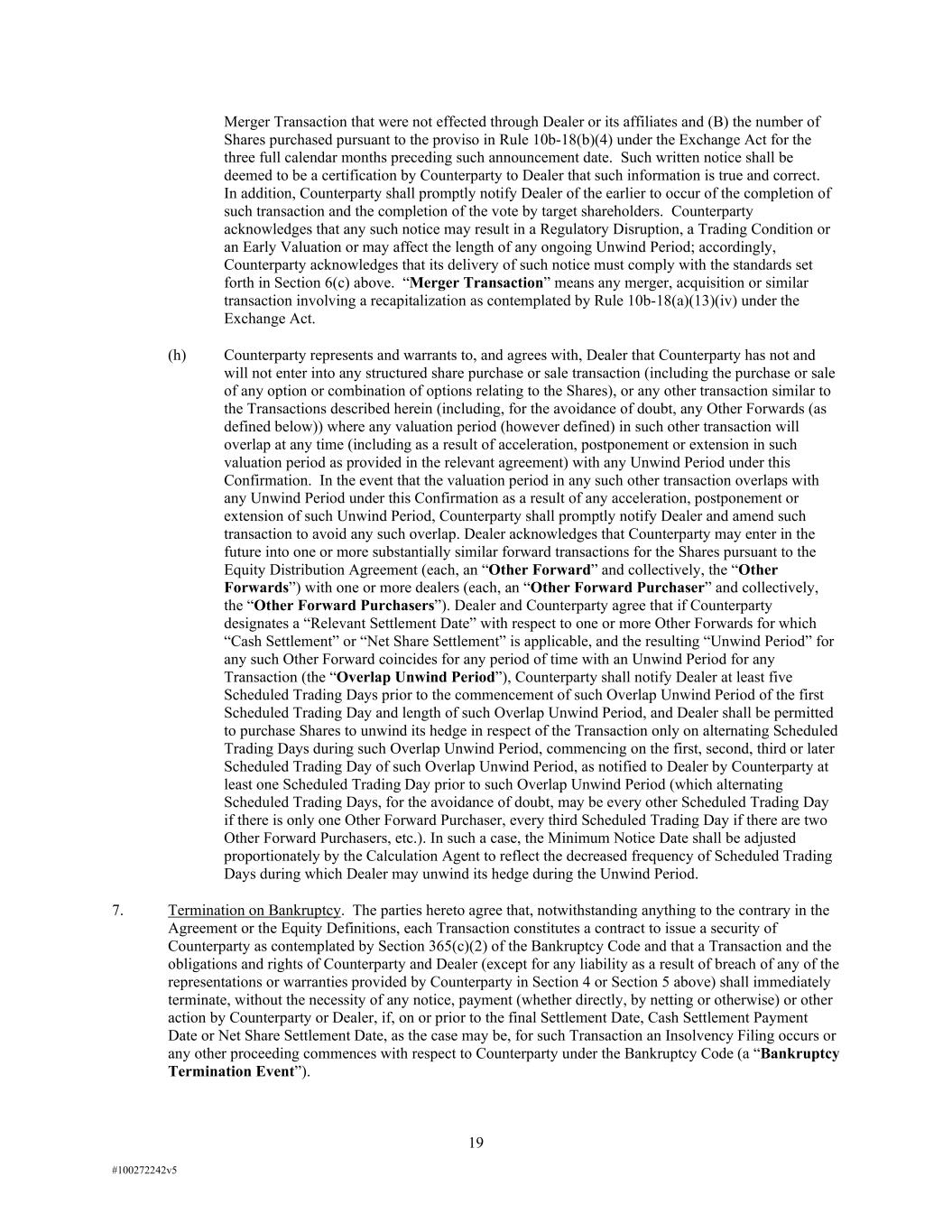 19 # 100272242v5未通过交易商或其关联公司进行的合并交易和(b)根据《交易法》第10b-18(b)(4)条规则的但书在该公告日期之前的三个完整日历月内购买的股份数量。该等书面通知应视为交易对手方对交易商的证明,证明该等信息真实、正确。此外,交易对方应将该交易完成和标的股东完成投票的较早情况及时通知交易商。交易对手承认,任何此类通知都可能导致监管中断、交易条件或提前估值,或可能影响任何正在进行的解禁期的长度;因此,交易对手承认,其交付此类通知必须遵守上文第6(c)节规定的标准。“合并交易”是指《交易法》第10b-18(a)(13)(iv)条规定的涉及资本重组的任何合并、收购或类似交易。(h)交易对手向交易商声明并保证并同意,交易对手没有也不会进行任何结构性股份购买或出售交易(包括购买或出售与股份有关的任何期权或期权组合),或任何类似于本文所述交易的其他交易(为免生疑问,包括任何其他远期(定义见下文)),而该等其他交易中的任何估值期(无论定义如何)将在任何时间重叠(包括由于加速,在相关协议规定的估值期内延期或延长)与本确认书项下的任何解盘期。如任何该等其他交易中的估值期因任何加速、延期或延长该等解盘期而与本确认书项下的任何解盘期重迭,交易对方应及时通知交易商并修正该等交易以避免任何该等重迭。交易商确认,交易对手可能在未来根据Equity Distribution协议就股份进行一项或多项实质上相似的远期交易(每项均为“其他远期”,统称为“其他远期”)与一名或多名交易商(每项均为“其他远期买方”,统称为“其他远期买方”)。交易商与交易对手约定,如果交易对手就一笔或多笔适用于“现金结算”或“净份额结算”的其他远期指定了“相关结算日”,而由此产生的任何该等其他远期的“解套期限”与任何交易的解套期限(“重叠解套期限”)在任何一段时间内重合,则交易对手应在第一个预定交易日的该重叠解套期限开始前至少五个预定交易日通知交易商,该重叠解套期限的长度,及交易商须获准购买股份以解除其就该交易的套期保值,惟须在该重迭解套期间内的交替预定交易日开始,由该重迭解套期间的第一个、第二个、第三个或更后的预定交易日开始,并由交易对手在该重迭解套期间前至少一个预定交易日通知交易商(为免生疑问,该交替预定交易日可在仅有一名其他远期买方的情况下,每隔第三个预定交易日,如有两名其他远期买方,等)。在这种情况下,最短通知日期应由计算代理按比例调整,以反映交易商在解套期间可能平仓的计划交易日的减少频率。7.破产时终止。双方同意,尽管协议或股权定义中有任何相反的规定,每项交易均构成《破产法》第365(c)(2)条所设想的发行交易对手担保的合同,并且交易以及交易对手和交易商的义务和权利(因违反上述第4条或第5条中交易对手提供的任何陈述或保证而产生的任何责任除外)应立即终止,而无需任何通知,付款(无论是直接,通过净额结算或其他方式)或交易对手或交易商的其他行动,如果在最终结算日、现金结算支付日或净股份结算日(视情况而定)或之前,就此类交易发生破产申报或根据《破产法》就交易对手启动任何其他程序(“破产终止事件”)。